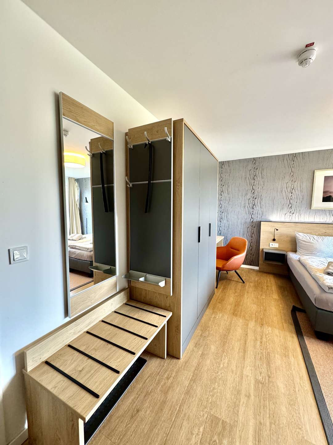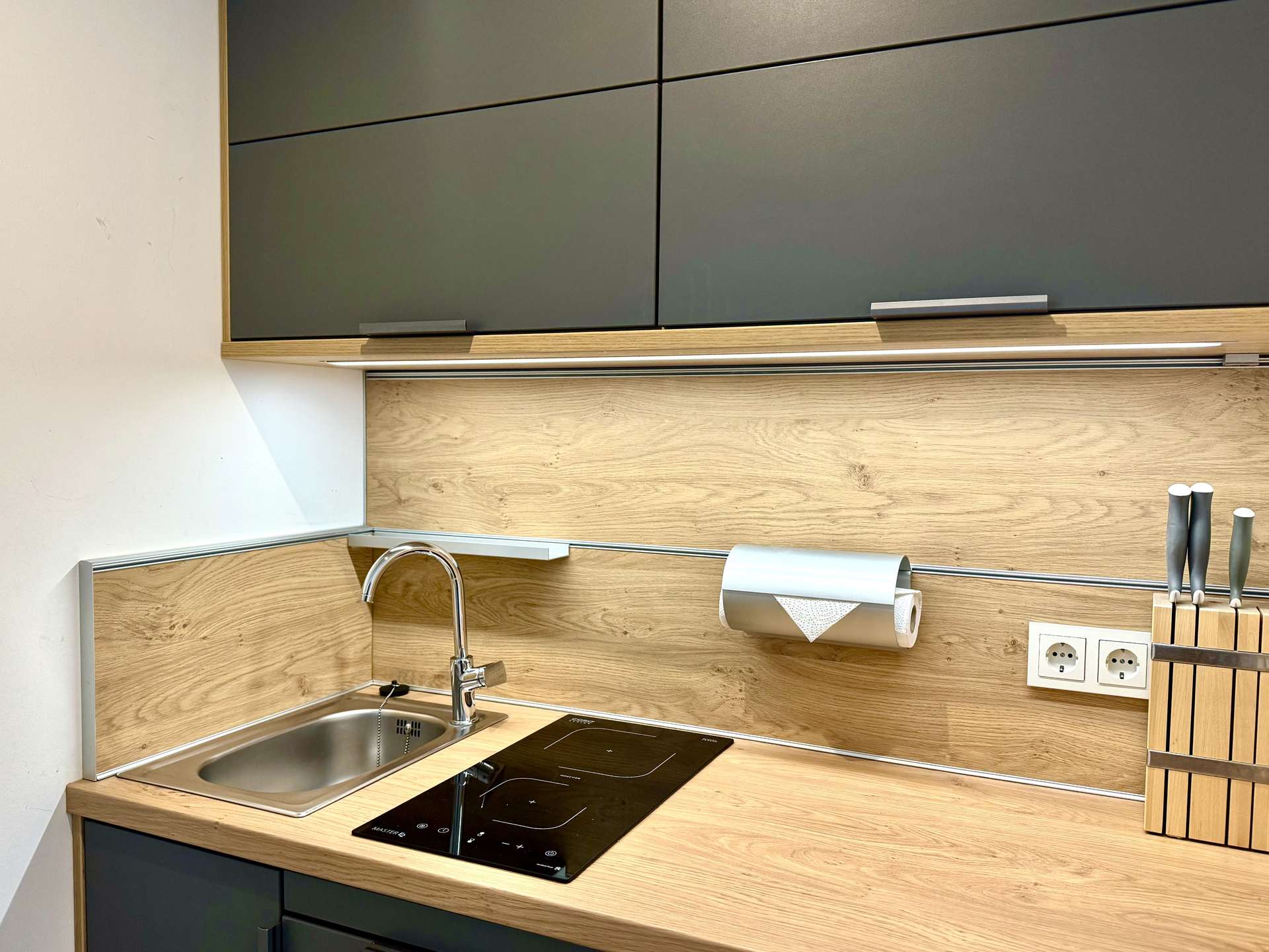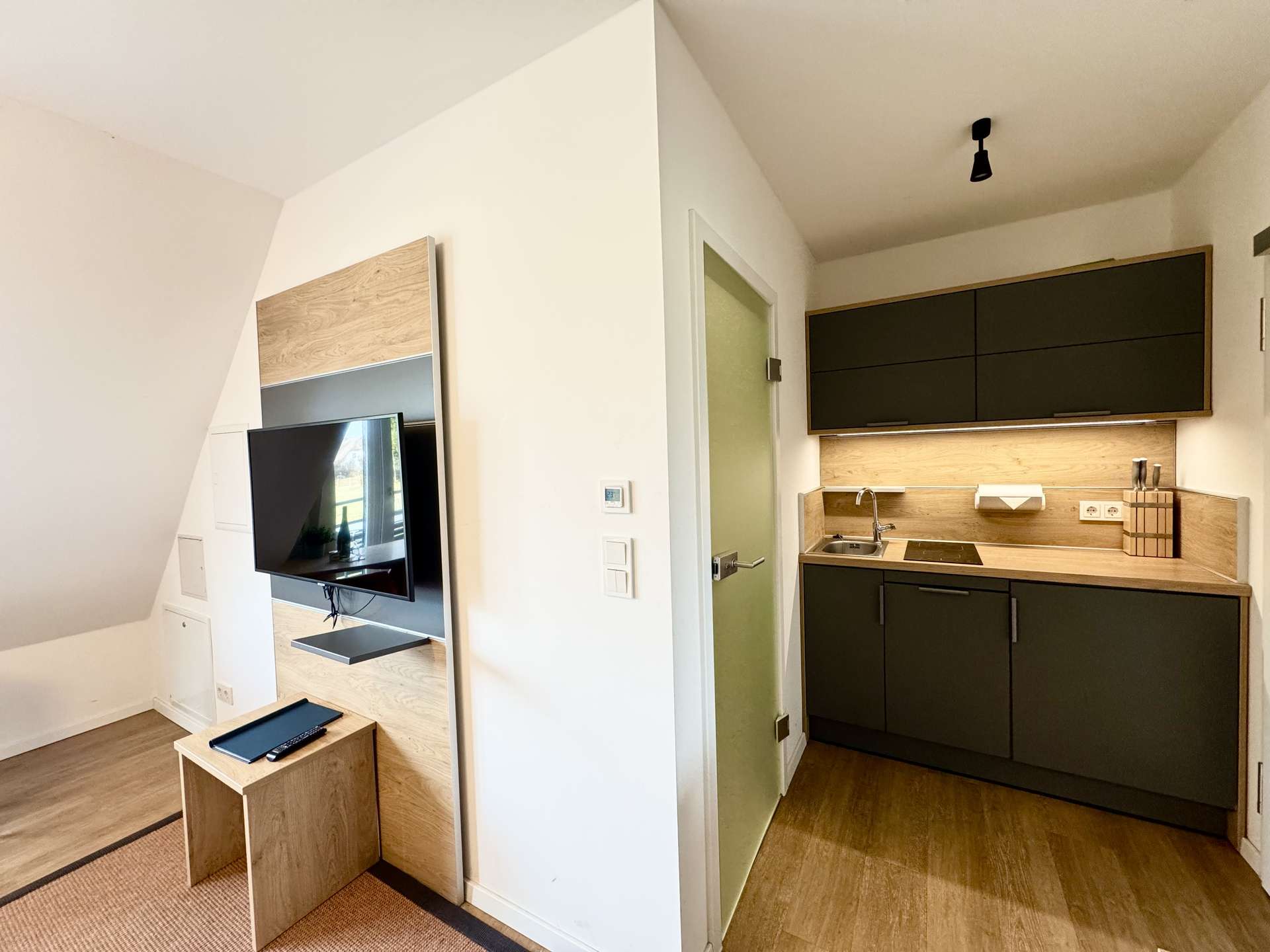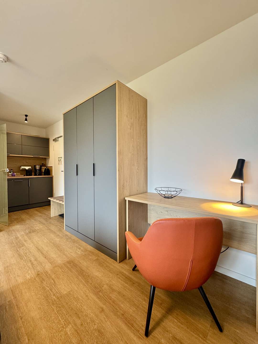 Das Studio überzeugt durch eine hochwertige Ausstattung sowie geschmackvolles Mobiliar, das Komfort und modernes Wohngefühl harmonisch miteinander verbindet. Die integrierte Küchenzeile ist funktional gestaltet und verfügt über einen Geschirrspüler, Kochfeld sowie Einbaukühlschrank. Das moderne Badezimmer mit ebenerdiger Dusche unterstreicht den hochwertigen Charakter der Wohnung und bietet zeitgemäßen Komfort. Das vorhandene Mobiliar ist bereits im Kaufpreis inbegriffen.