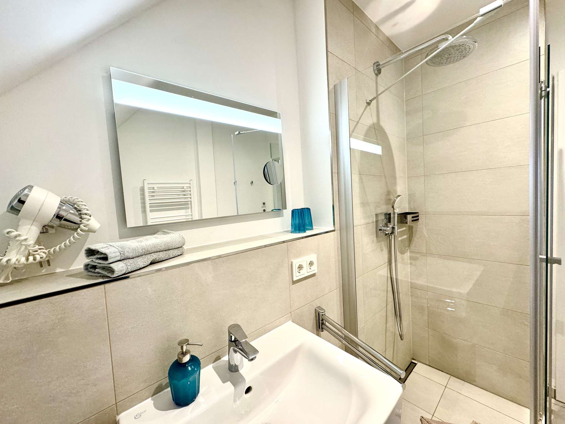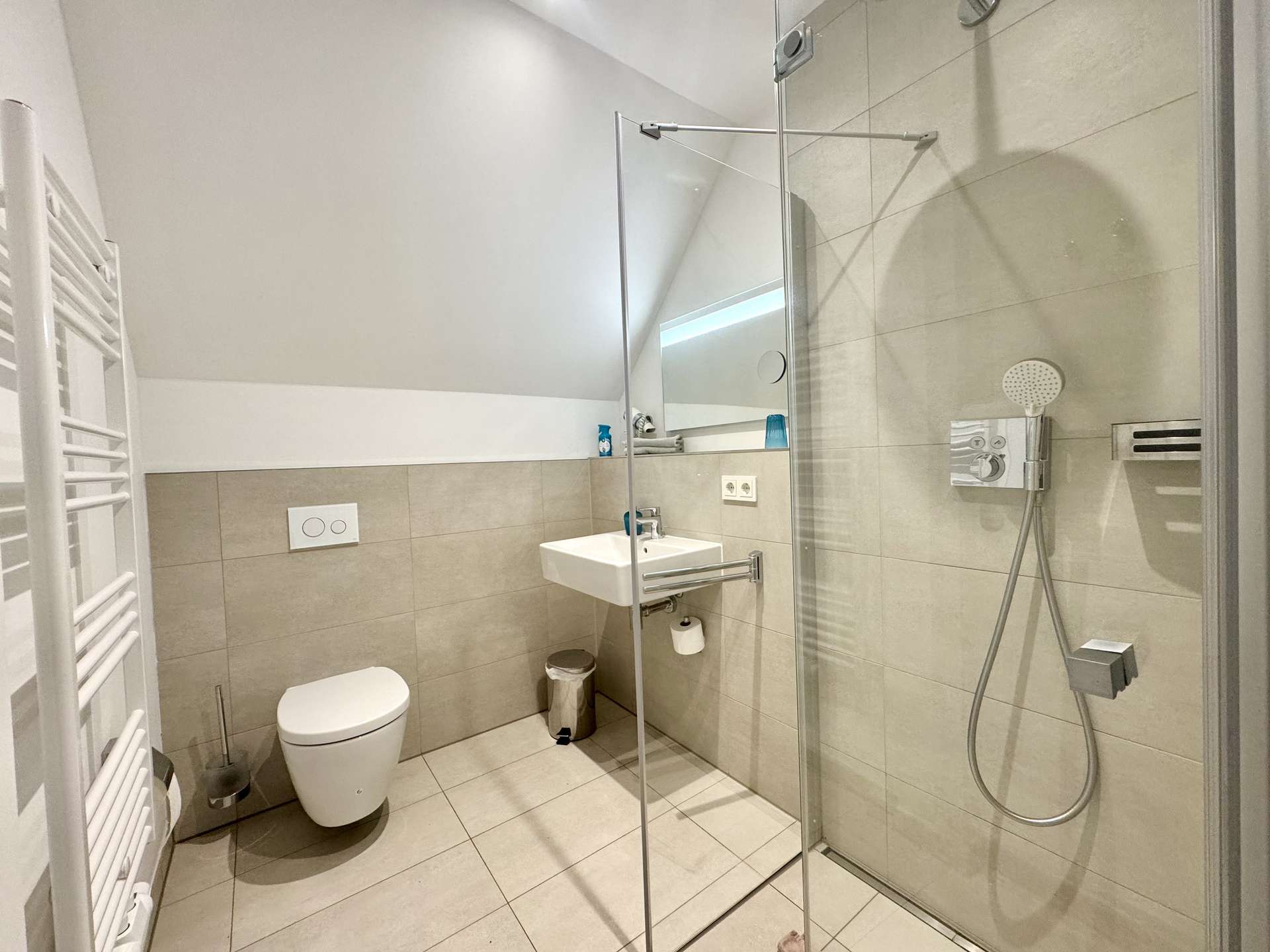 - Badezimmer mit ebenerdiger Dusche, WC, Waschbecken Handtuchheizkörper und beleuchtetem Spiegel