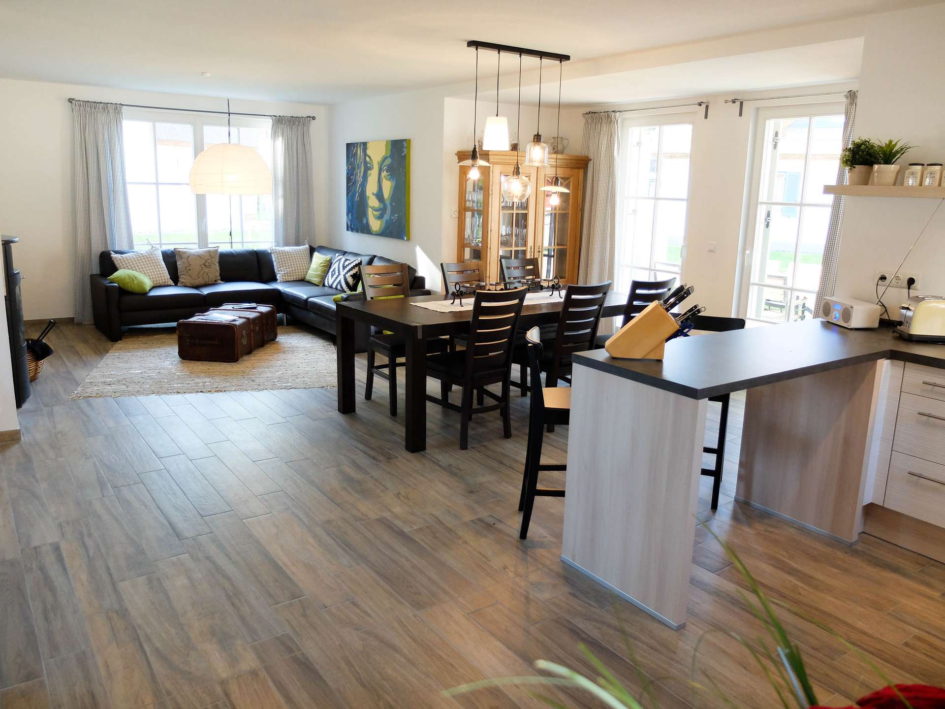 Das Herzstück des Hauses bildet der großzügige, offen gestaltete Wohn- und Essbereich mit integrierter Wohnküche. Die stilvolle, vollausgestattete Einbauküche ergänzt das offene Wohnkonzept auf harmonische Weise und verleiht dem Raum eine Wohnqualität der besonderen Art. Bodentiefe Fensterflächen sorgen für viel Tageslicht und eröffnen den direkten Zugang zur sonnigen Terrasse sowie in den gepflegten Garten. Ein Kamin setzt im Wohnbereich einen stilvollen Akzent und unterstreicht das gemütliche Ambiente.