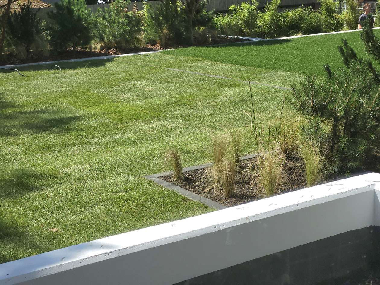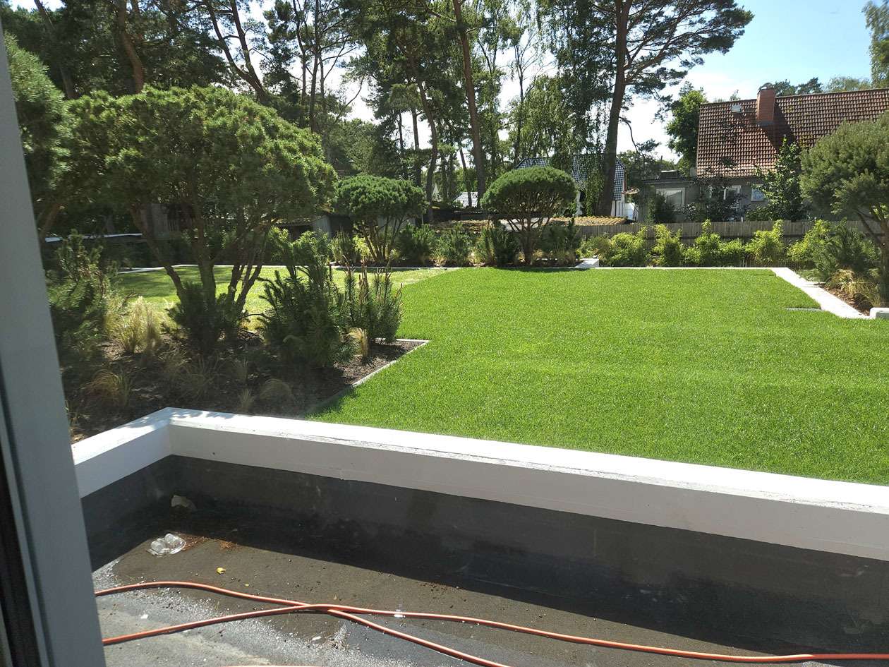 aufwendige Gestaltung des Außenbereichs mit Hochbeeten, Bambushecken, Gräsern und Gehölzen