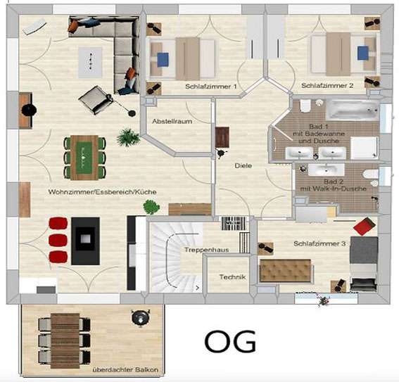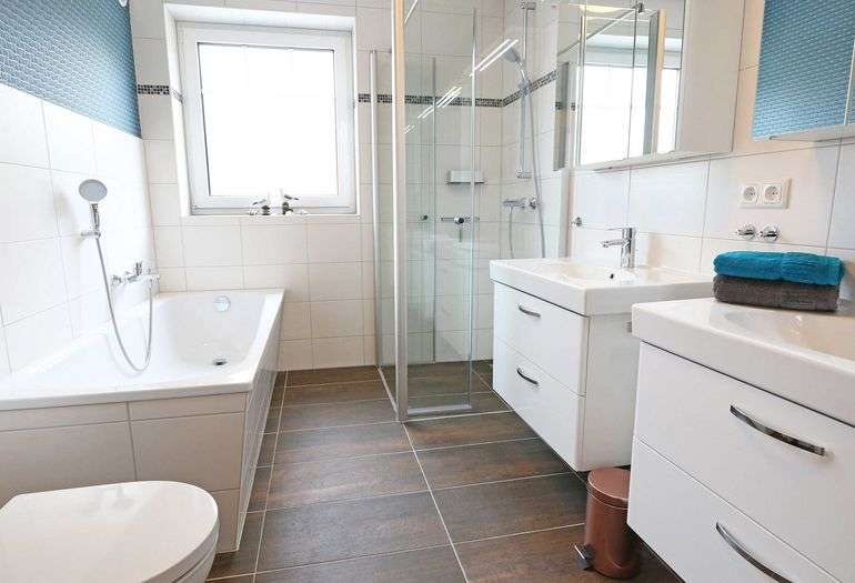 Die Villa beherbergt insgesamt zwei eigenständige, großzügig geschnittene Wohneinheiten im Erd- und Obergeschoss. Beide Einheiten überzeugen durch helle, offen gestaltete Wohn- und Essbereiche mit hochwertiger Einbauküche und fließenden Übergängen nach draußen: Im Erdgeschoss durch eine sonnige Terrasse, im Obergeschoss durch einen weitläufigen Balkon. Jede Wohnung verfügt über drei geräumige Schlafzimmer sowie zwei elegante Tageslichtbäder, ausgestattet mit bodengleichen Duschen und hochwertigen Sanitärobjekten. Eine der Einheiten bietet sich zudem hervorragend für die Vermietung an Feriengäste an – eine attraktive Möglichkeit zur Erzielung zusätzlicher Einnahmen.