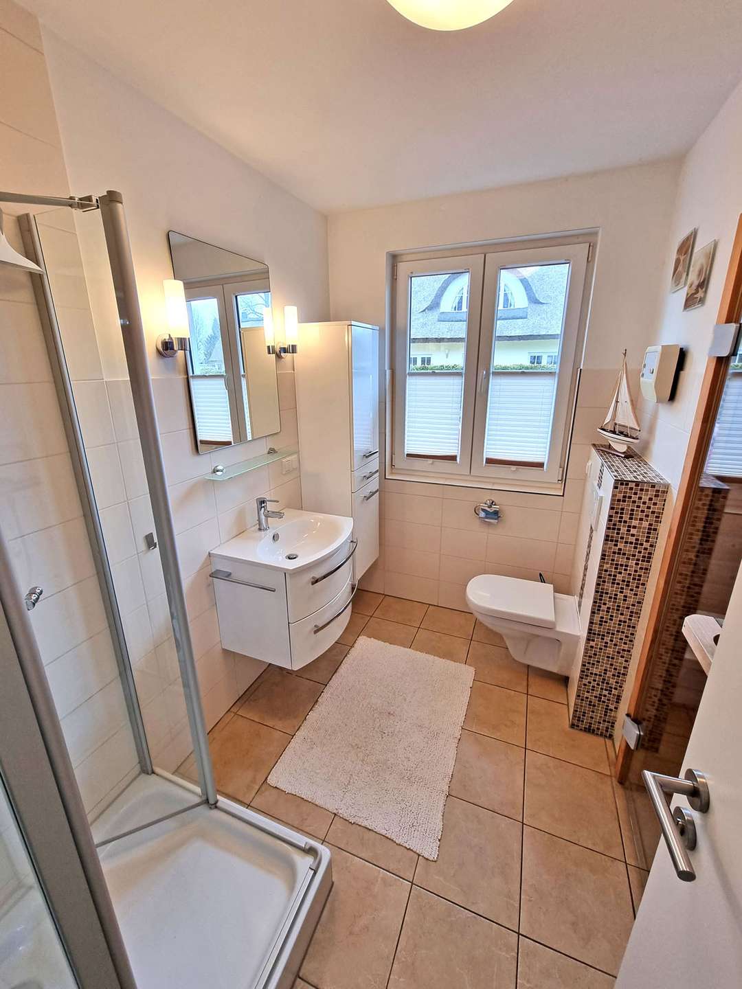 Besonders erwähnenswert sind die elektrischen Fensterrollos, die für die gewünschte Privatsphäre sorgen. Zudem sorgt eine Fußbodenheizung in allen Räumen zu jeder Zeit für Gemütlichkeit und angenehme Wärme. Im Obergeschoss befinden sich drei mit Liebe zum Detail gestaltete Schlafzimmer sowie ein lichtdurchflutetes Wannenbad.