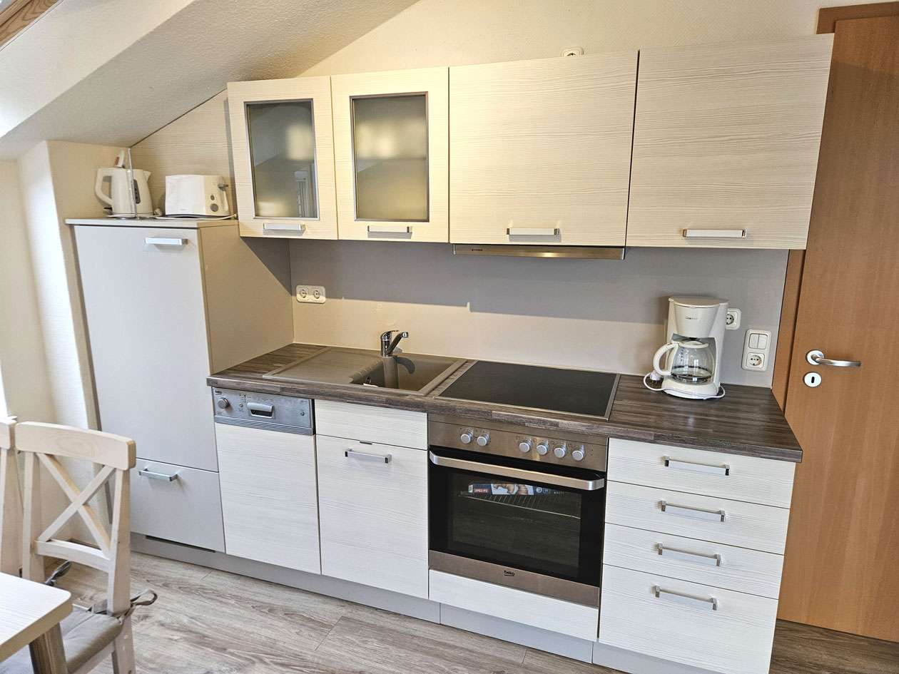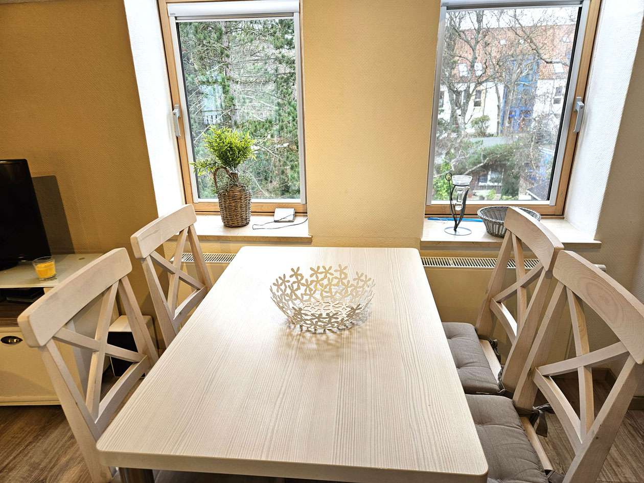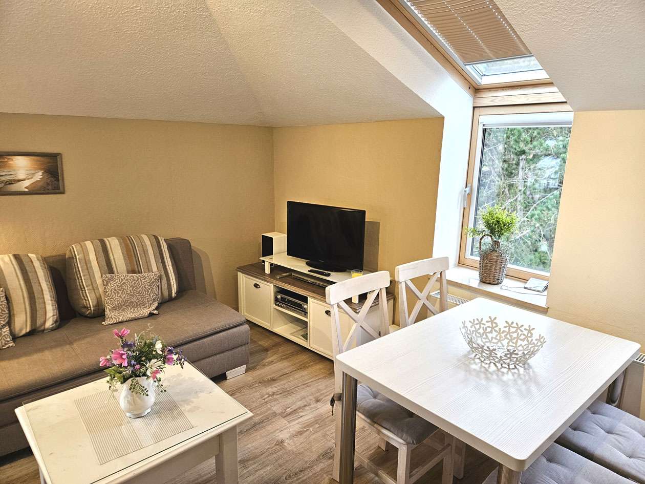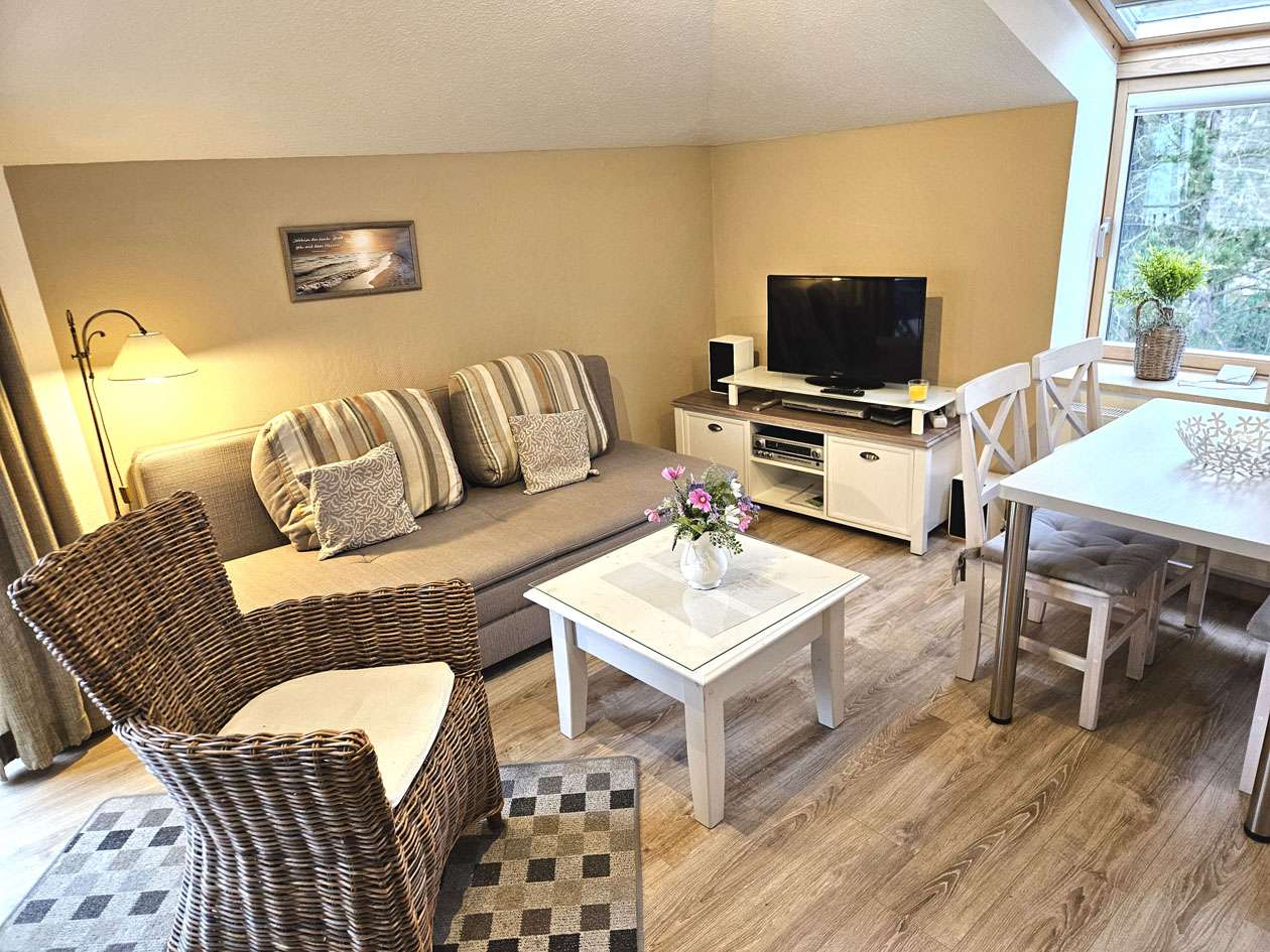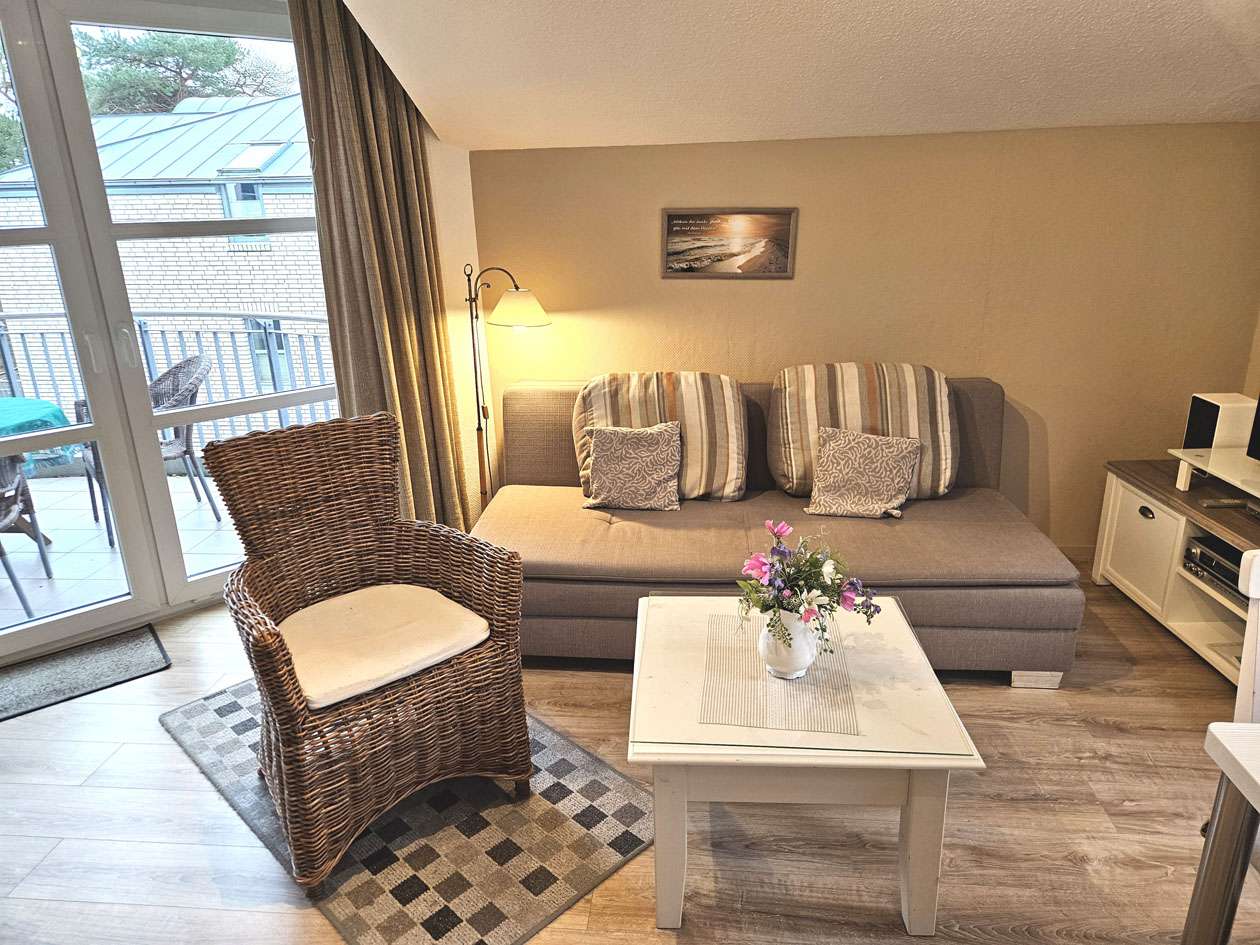 Der einladende Wohnbereich überzeugt durch seine freundliche Atmosphäre und bildet gemeinsam mit der integrierten Einbauküche das Herzstück der Wohnung. Das separat gelegene Schlafzimmer bietet eine ruhige Rückzugsmöglichkeit mit hohem Erholungswert. Das zeitlos geflieste Badezimmer ist funktional ausgestattet. Insgesamt befindet sich die Wohnung in einem sehr gepflegten Zustand und unterstreicht mit ihrer harmonischen Ausstattung den Charakter einer gemütlichen und hochwertigen Ferienimmobilie.