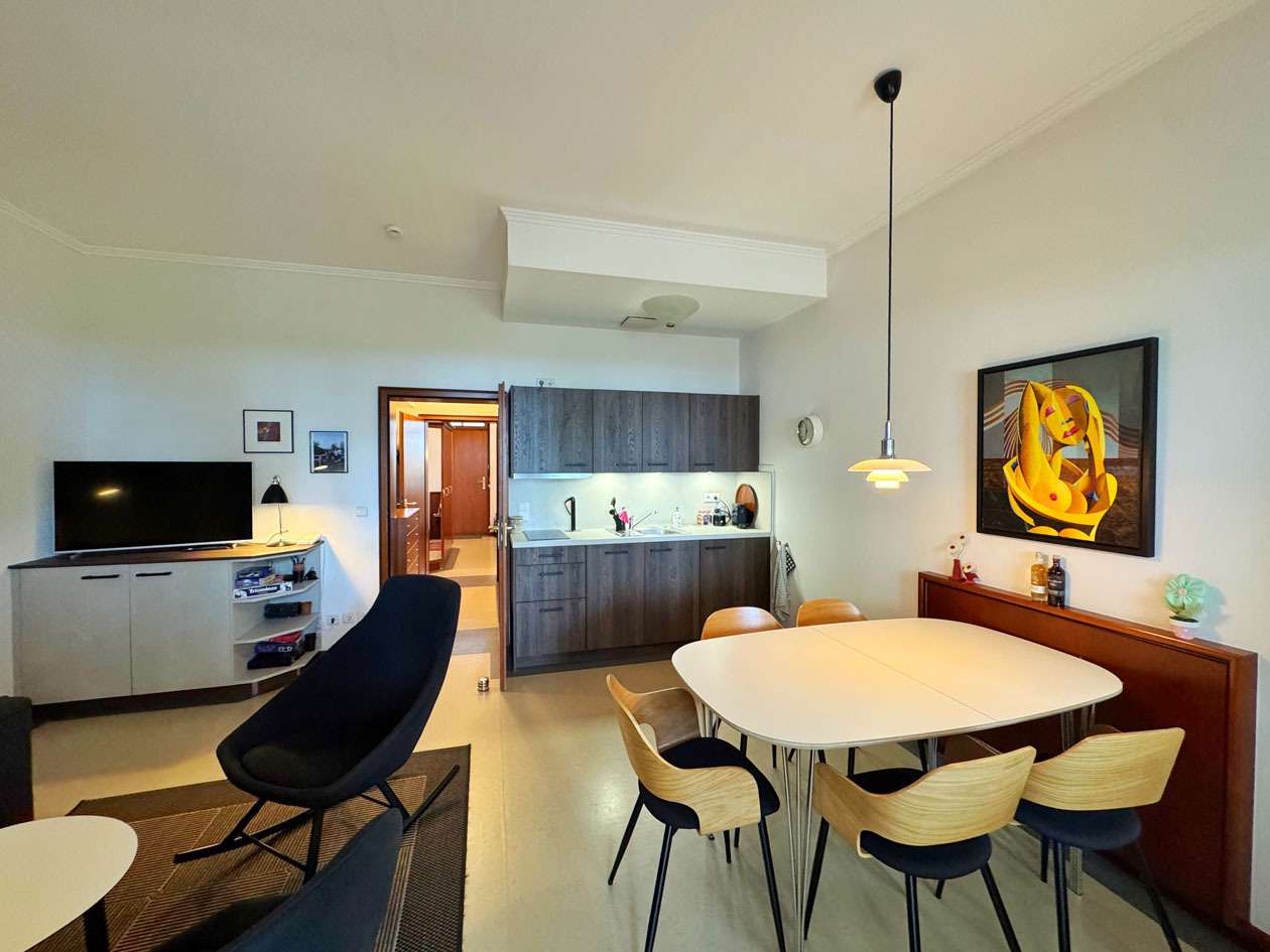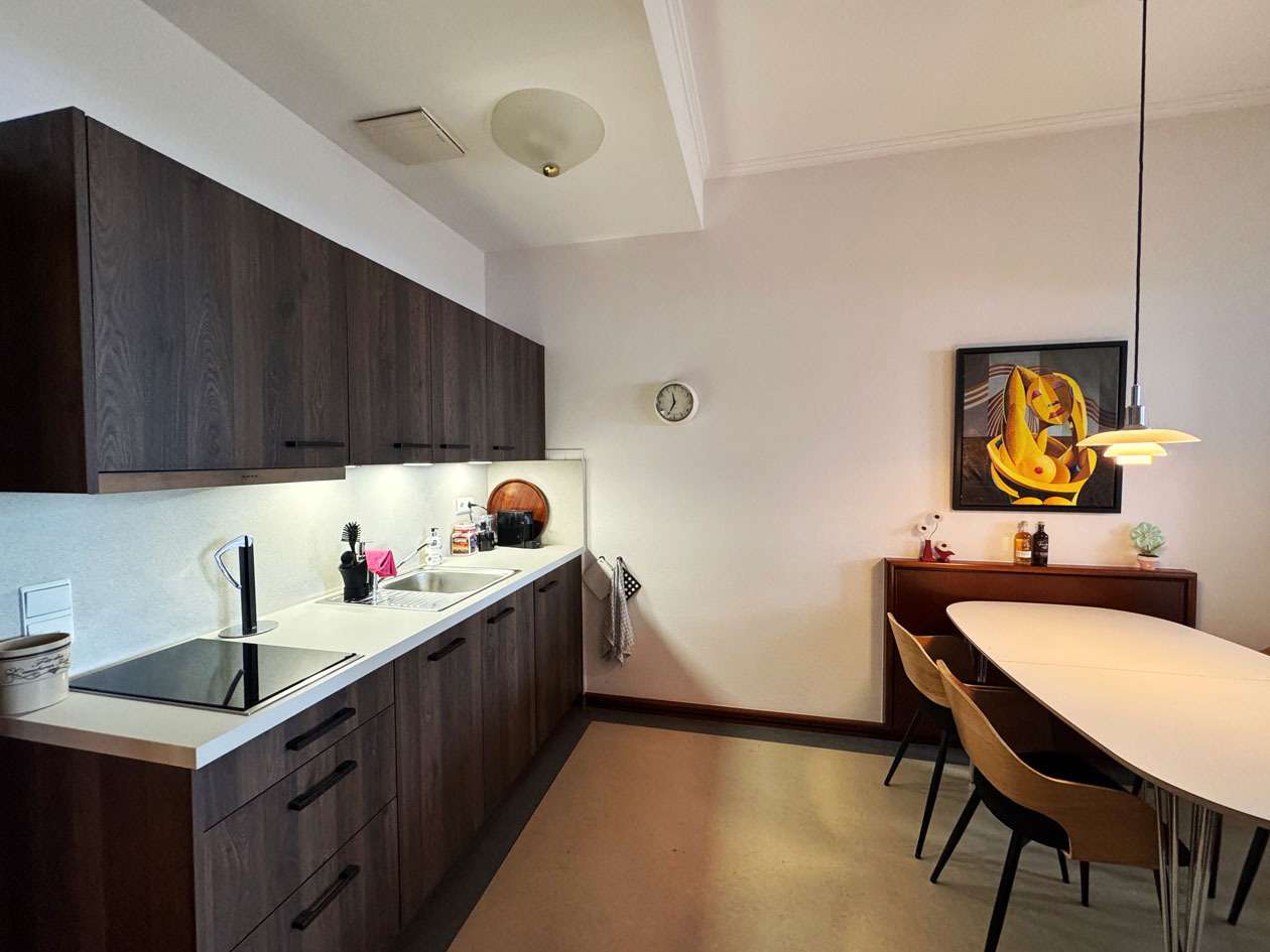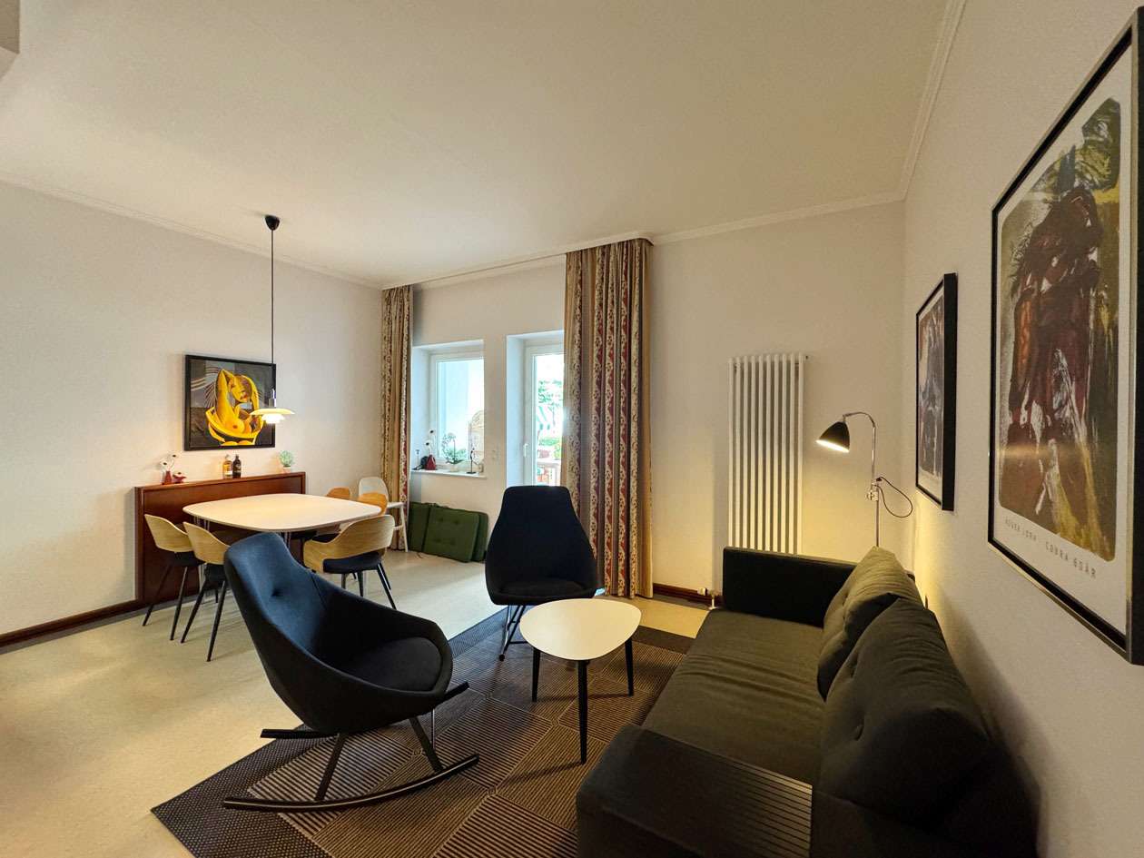 Ein Tiefgaragenstellplatz ist der Wohnung zugehörig. Das vorhandene Mobiliar (exkl. Gemälde über dem Esstisch) ist im Kaufpreis inbegriffen.