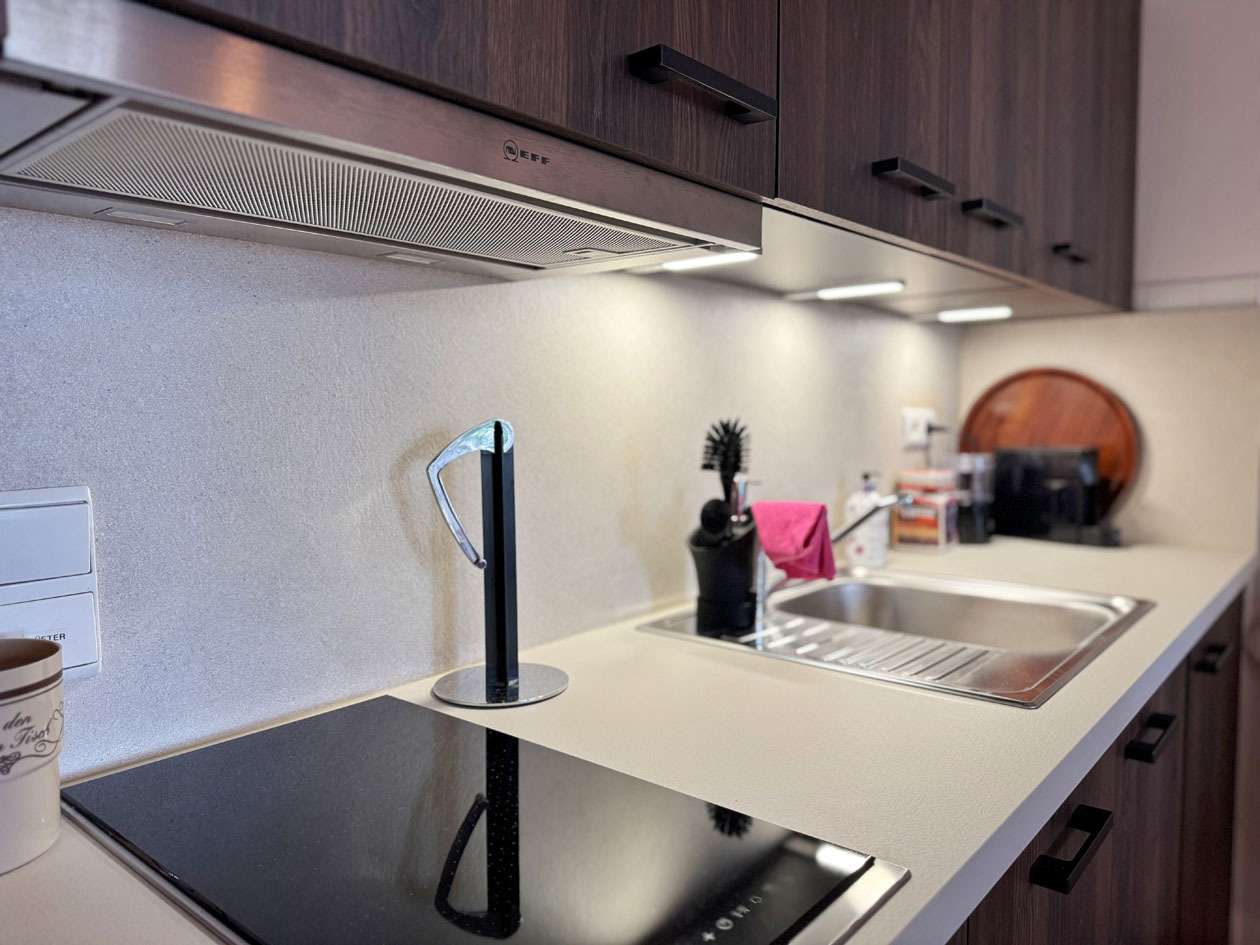 Die Küche ist mit hochwertigen Elektrogeräten der Marke NEFF ausgestattet. Mobiliar und Einrichtung im Wohn- und Essbereich wurden vor etwa drei Jahren vollständig erneuert und präsentieren sich in einem einladenden Stil.