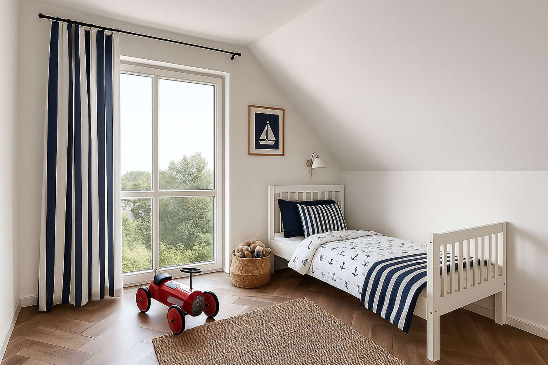 Das Dachgeschoss bietet vom Flur ausgehend, 2 großzügige Schlafräume, einen Abstellraum und ein Tageslicht-Vollbad mit Badewanne, Dusche und Doppel -Waschtisch.
