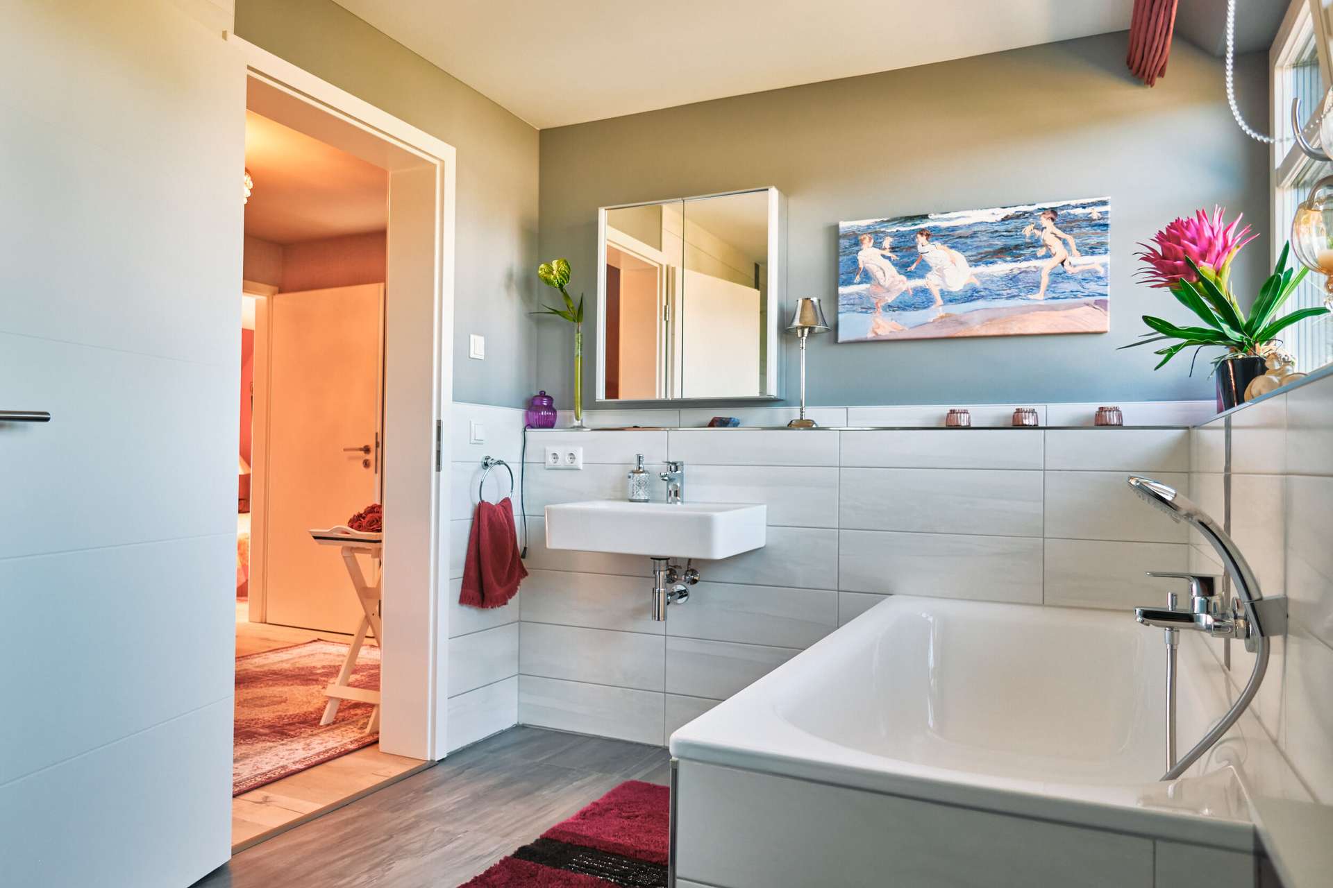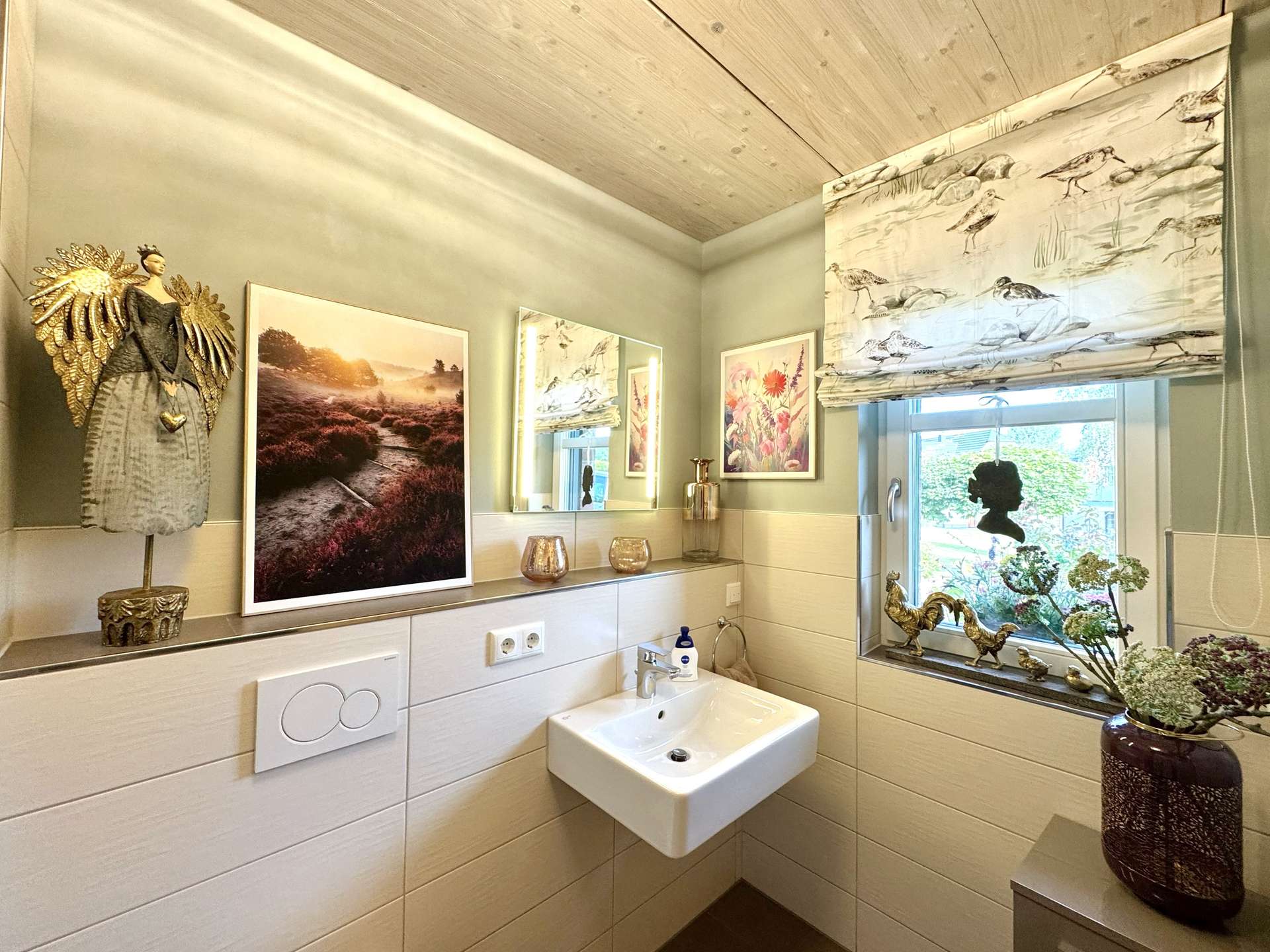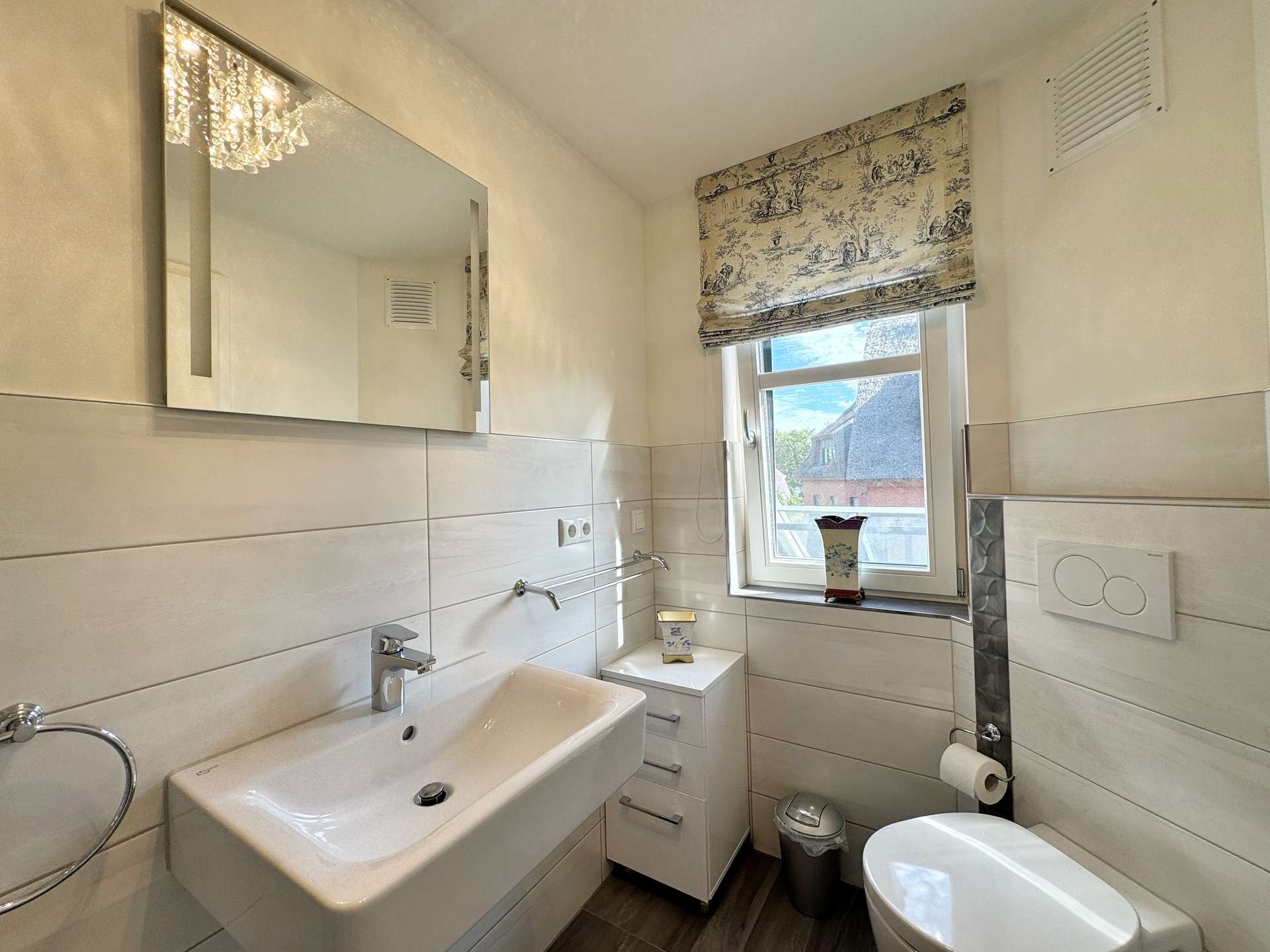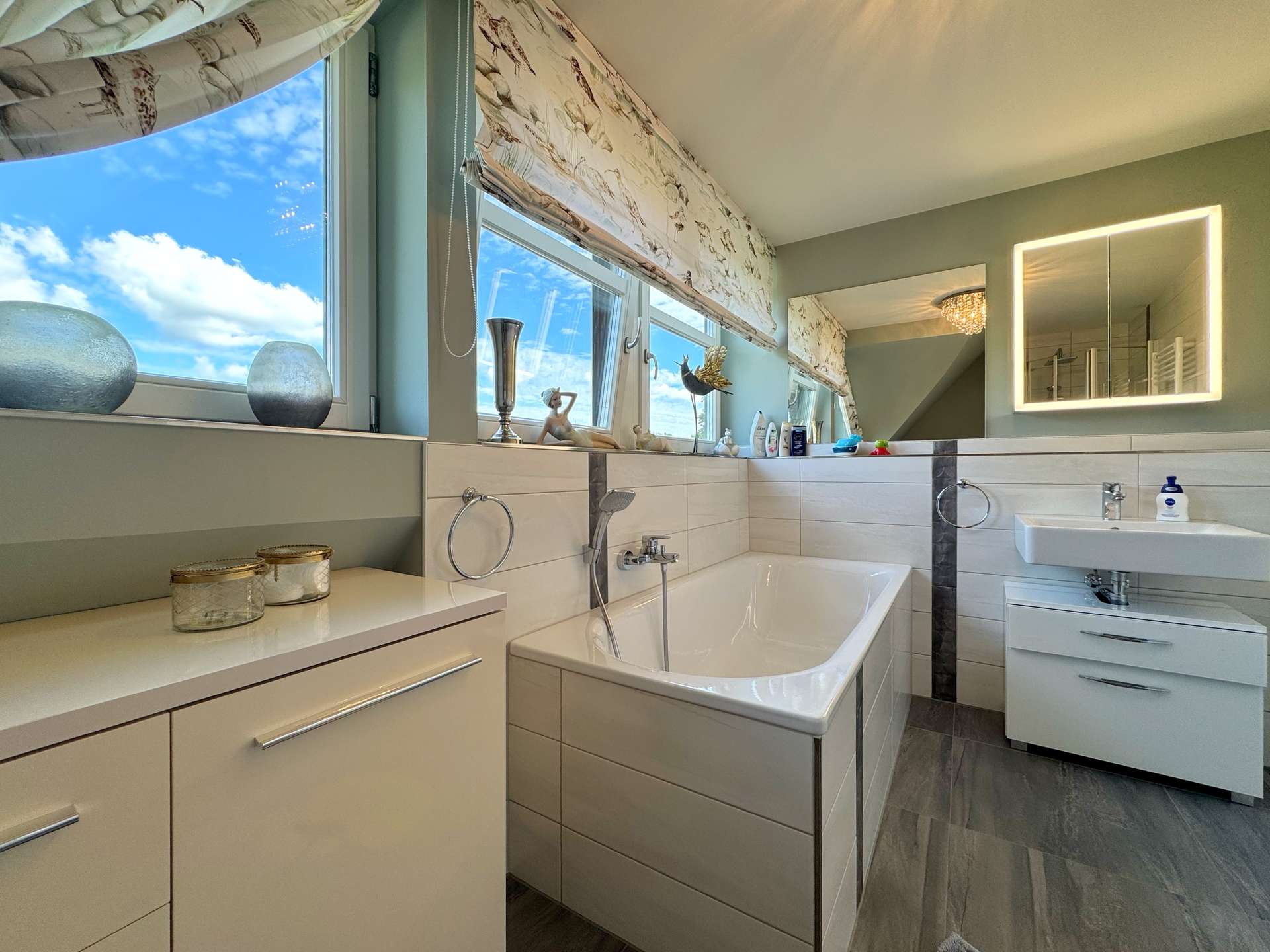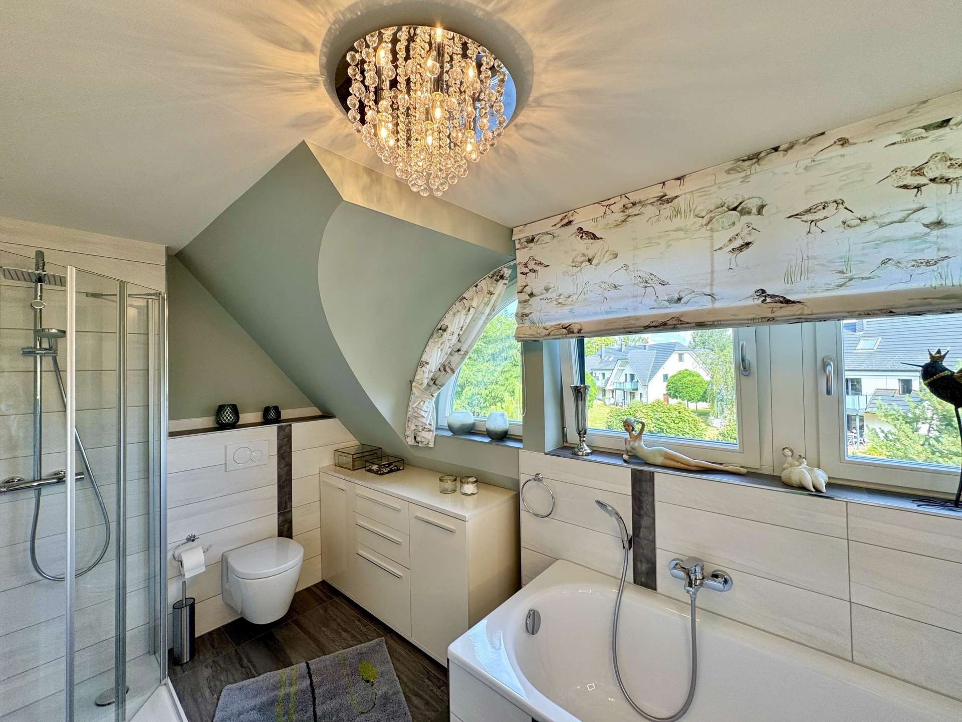 - Hauptbad mit Fenster (Obergeschoss) ausgestattet mit Dusche, Waschbecken, WC, beleuchtetem Spiegel, Badewanne