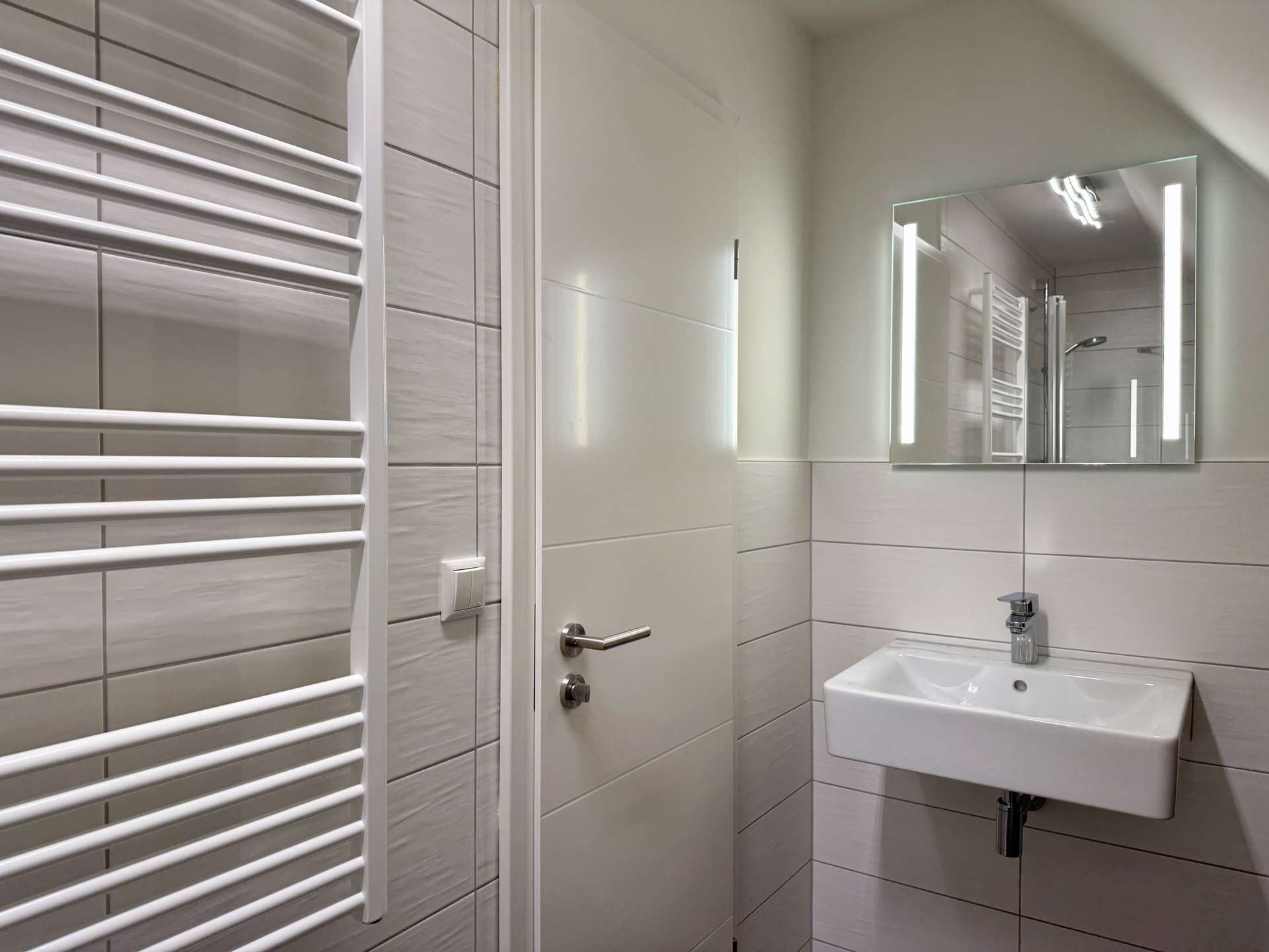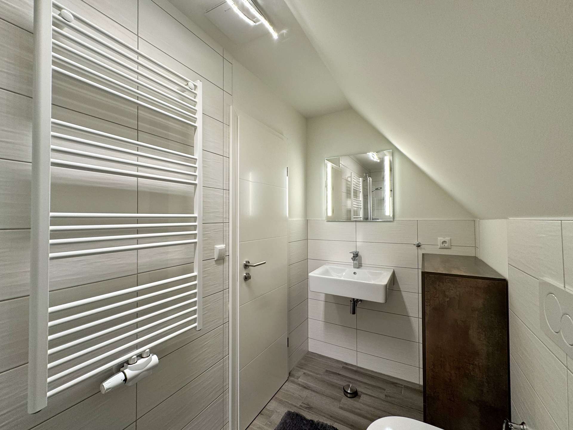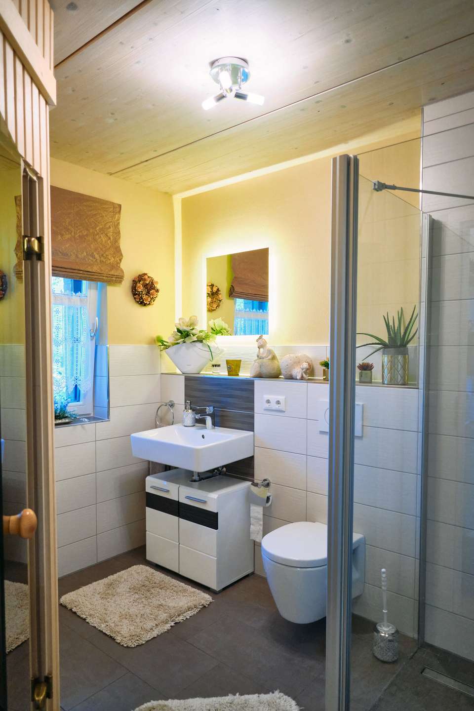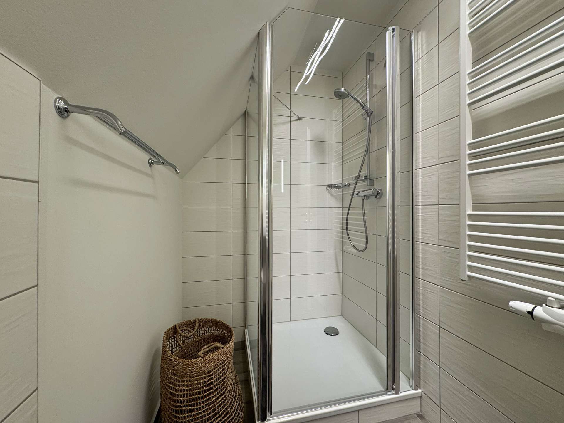 - Duschbad im Spitzboden ausgestattet mit Dusche, Waschbecken, WC, beleuchtetem Spiegel