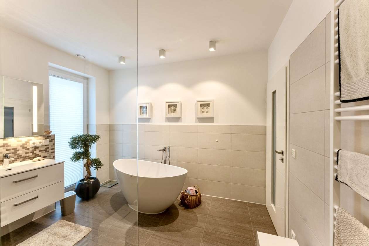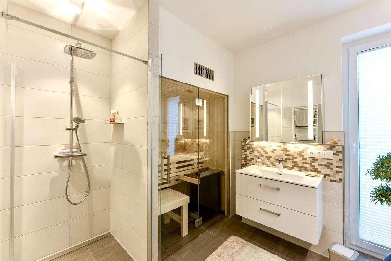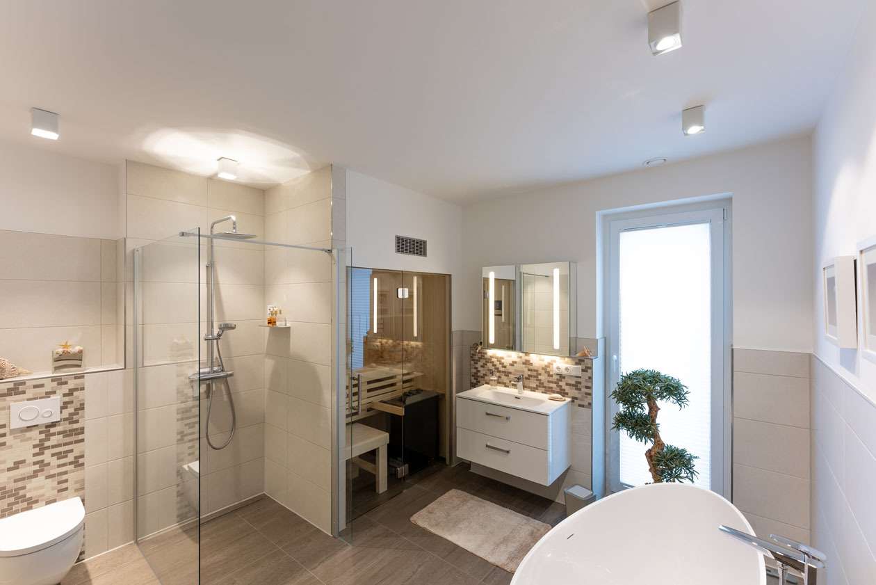 - Masterbad mit freistehender Badewanne, bodengleicher Dusche, Sauna Typ LifeLine mit Glasfront und Ganzglastür