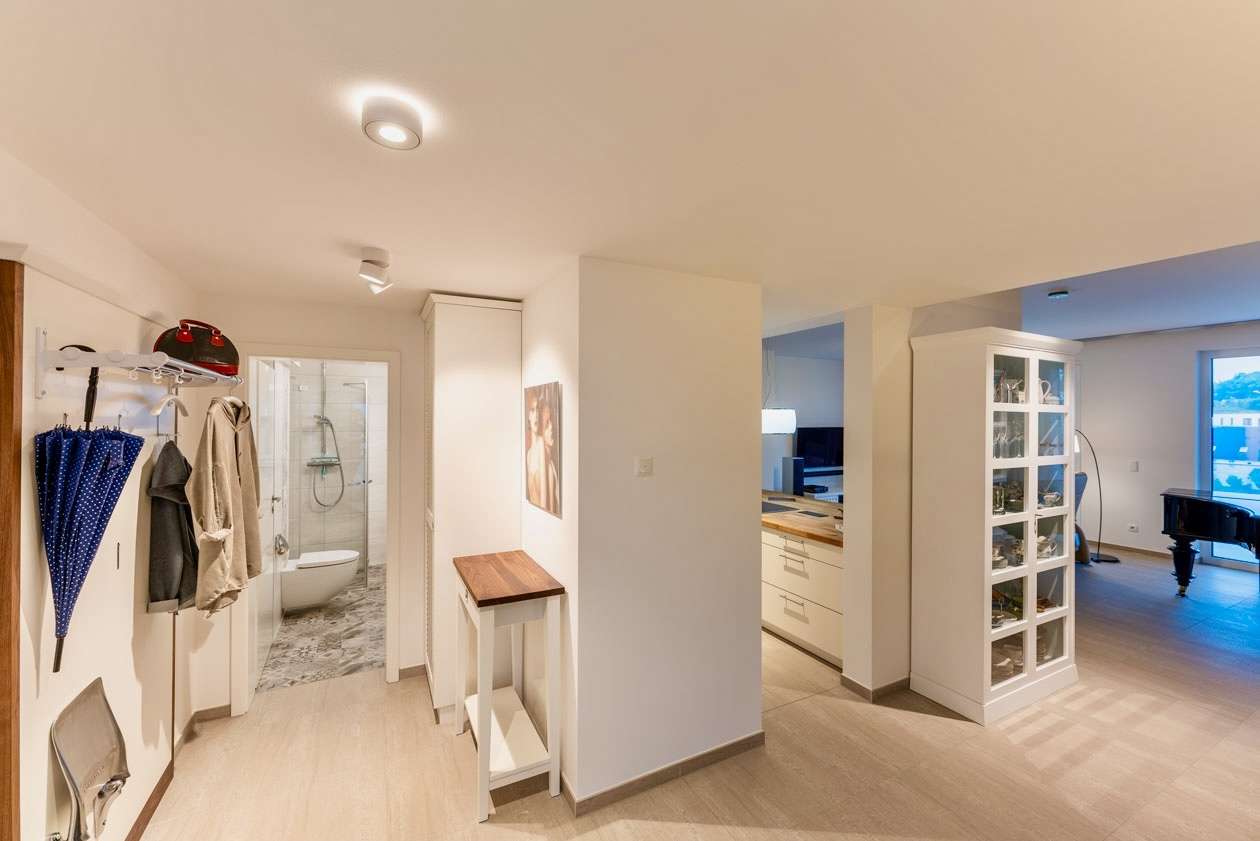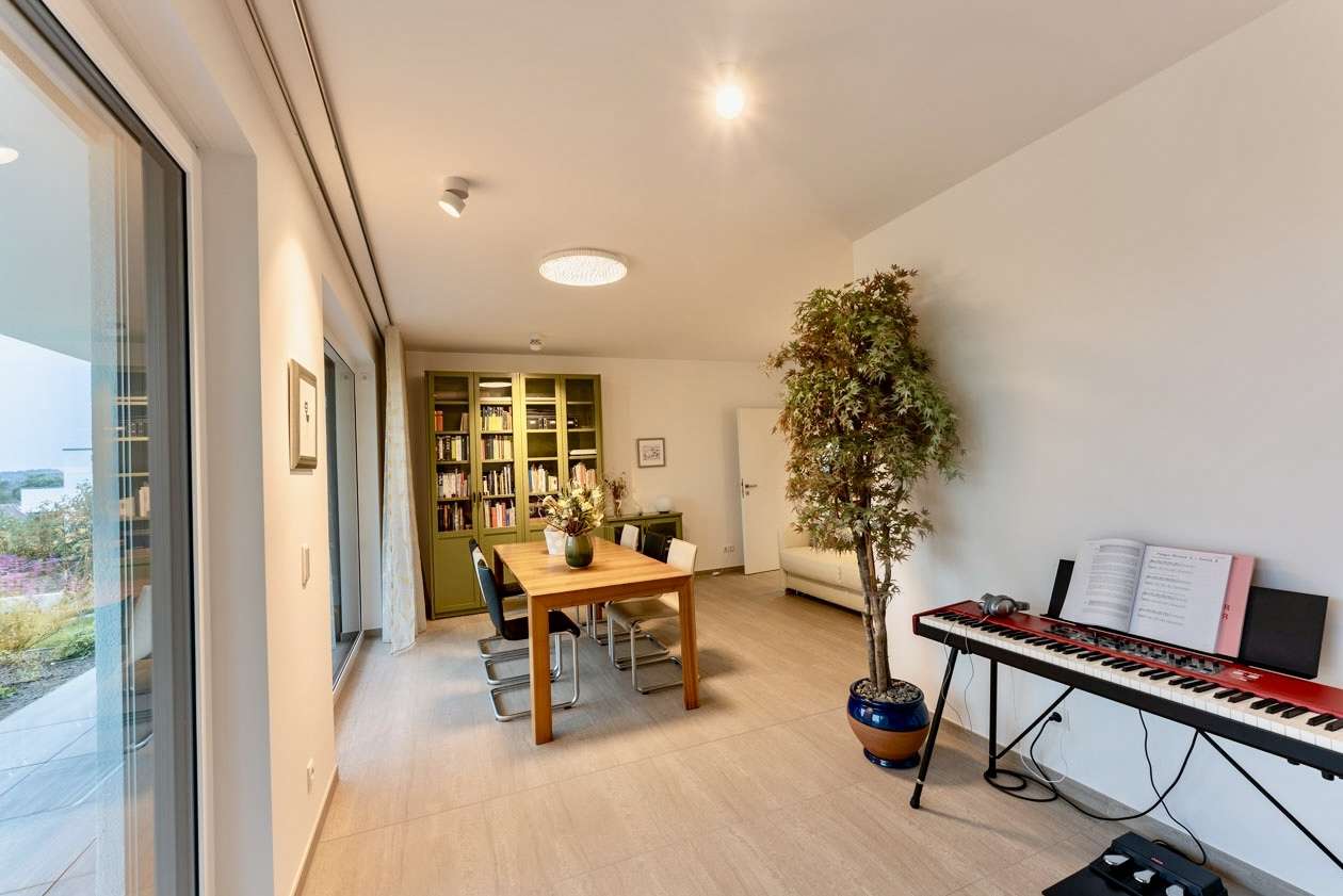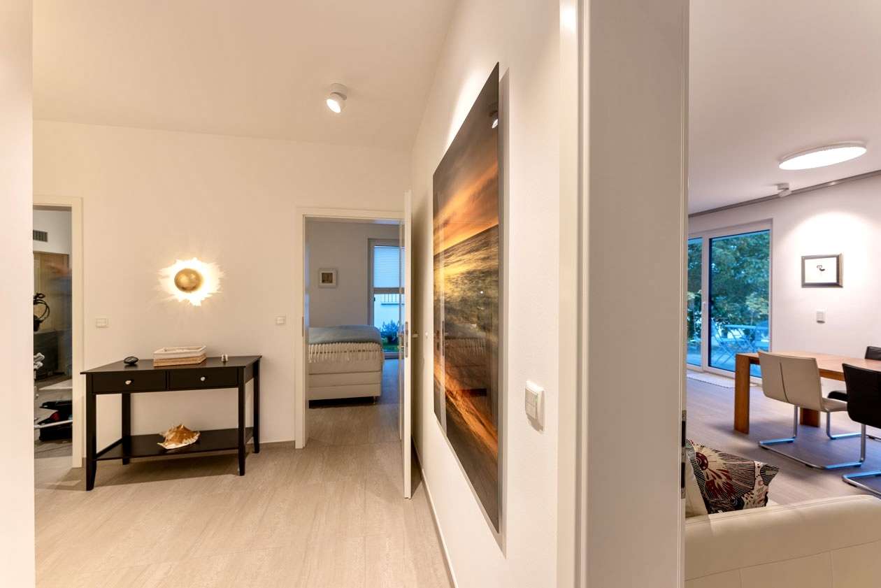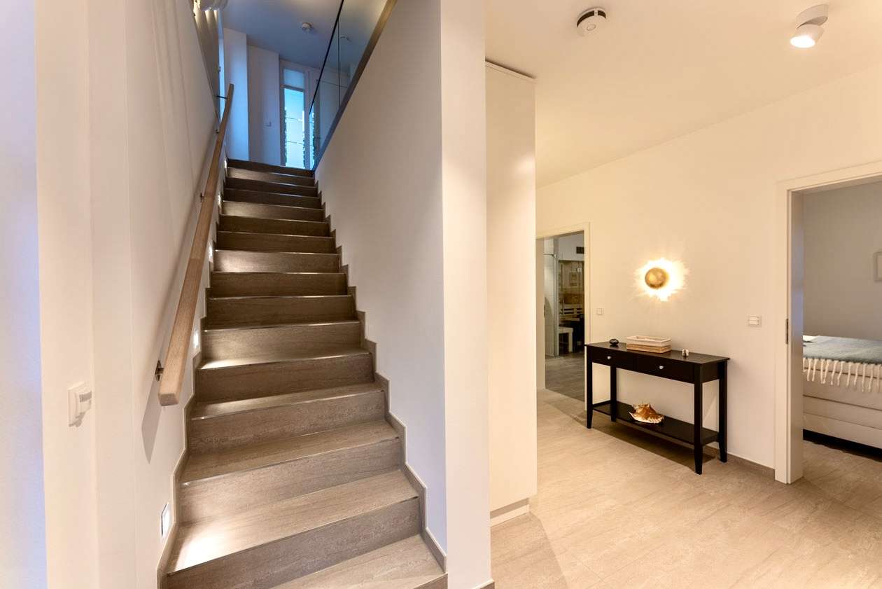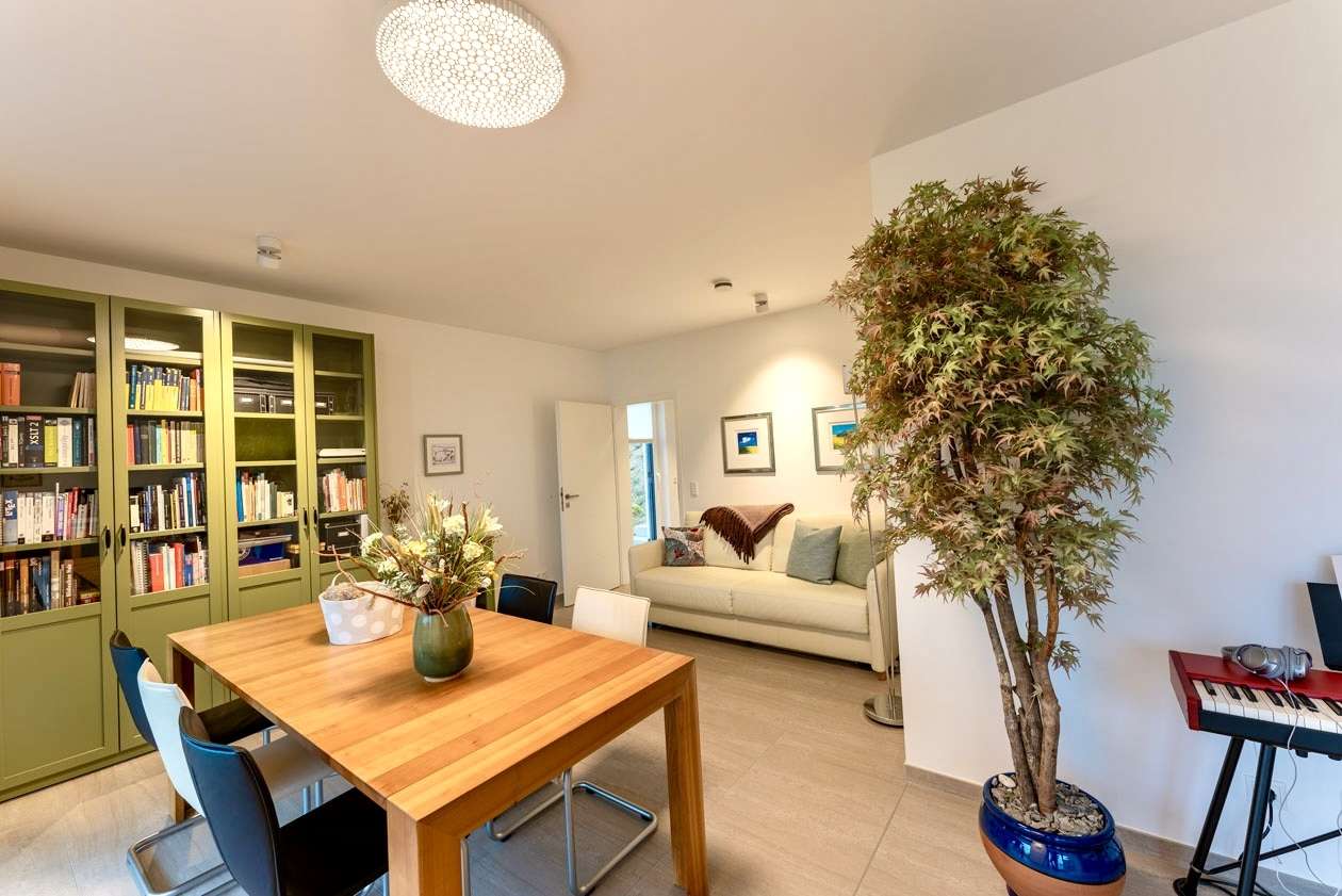 Über die geradlinig geführte Treppe wird das Erdgeschoss mit dem taghellen Gartengeschoss verbunden. Hier eröffnet sich ein Gästebereich mit Zugang zur Terrasse und dem äußerst gepflegten Garten.