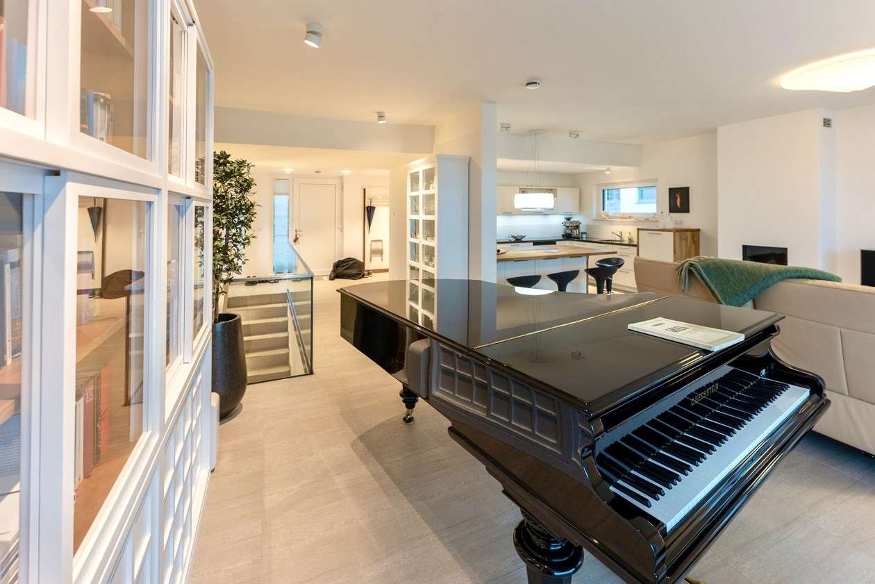 Die lichterfüllten Räumlichkeiten erstrecken sich auf rund 163 qm Wohnfläche. Großzügige Fensterfronten, fließende Übergänge zwischen den Wohnbereichen und ein harmonisch abgestimmtes Lichtdesign verleihen dem Erdgeschoss seine unverwechselbare Atmosphäre. Wohnen, Kochen und Essen interpretiert auf höchstem Niveau verschmelzen zu einem offenen Lebensraum mit Galeriecharakter. Eine sonnige Dachterrasse mit Blick auf den Schmachter See erweitert den Wohnbereich nach außen und fügt sich nahtlos in das architektonische Gesamtkonzept ein.