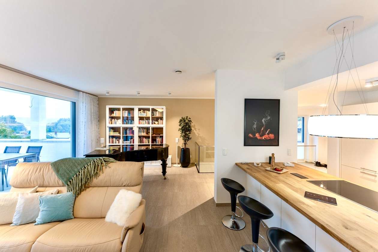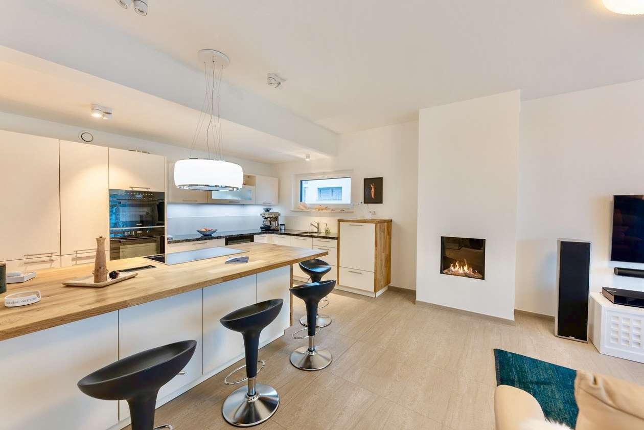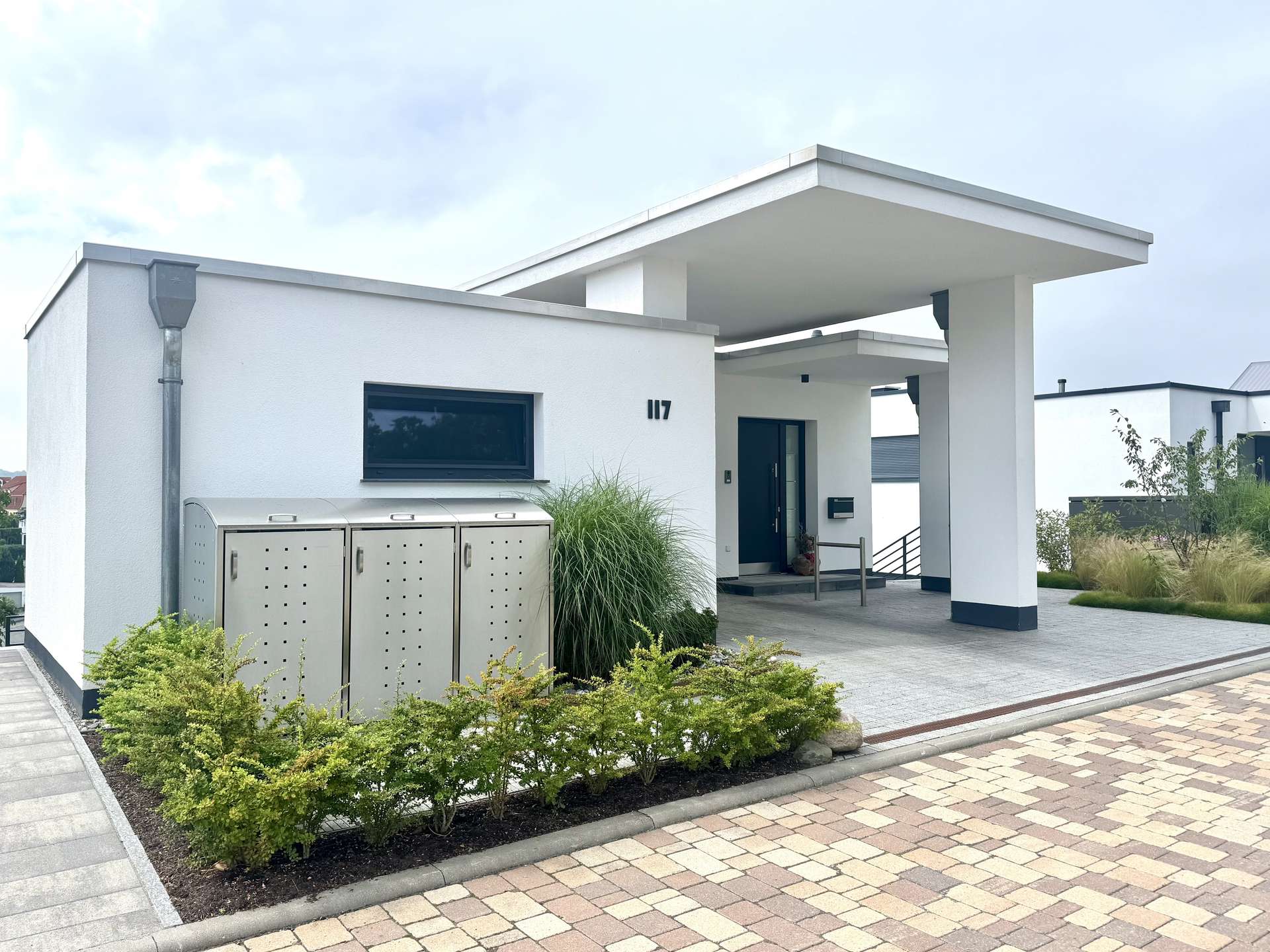 Die detailreiche Ausstattung zeugt von höchstem Qualitätsbewusstsein mit feinem Gespür für zeitlose Eleganz. Eine exklusive Einbauküche mit Miele-Geräten, großformatige, edel strukturierte Feinsteinzeugböden sowie ein stilvoll integrierter Gaskamin schaffen ein Ambiente von höchster Wohnqualität. Ergänzt wird das Interieur durch ein vollintegriertes Smart-Home-System, das Temperatur- und Beleuchtungsregelung sowie das Öffnen und Schließen der Fenster intuitiv über eine zentrale, digital vernetzte Steuerung ermöglicht. Komplettiert wird diese Spitzenimmobilie durch einen Carport mit angrenzendem Abstellraum direkt vor dem Haus.
