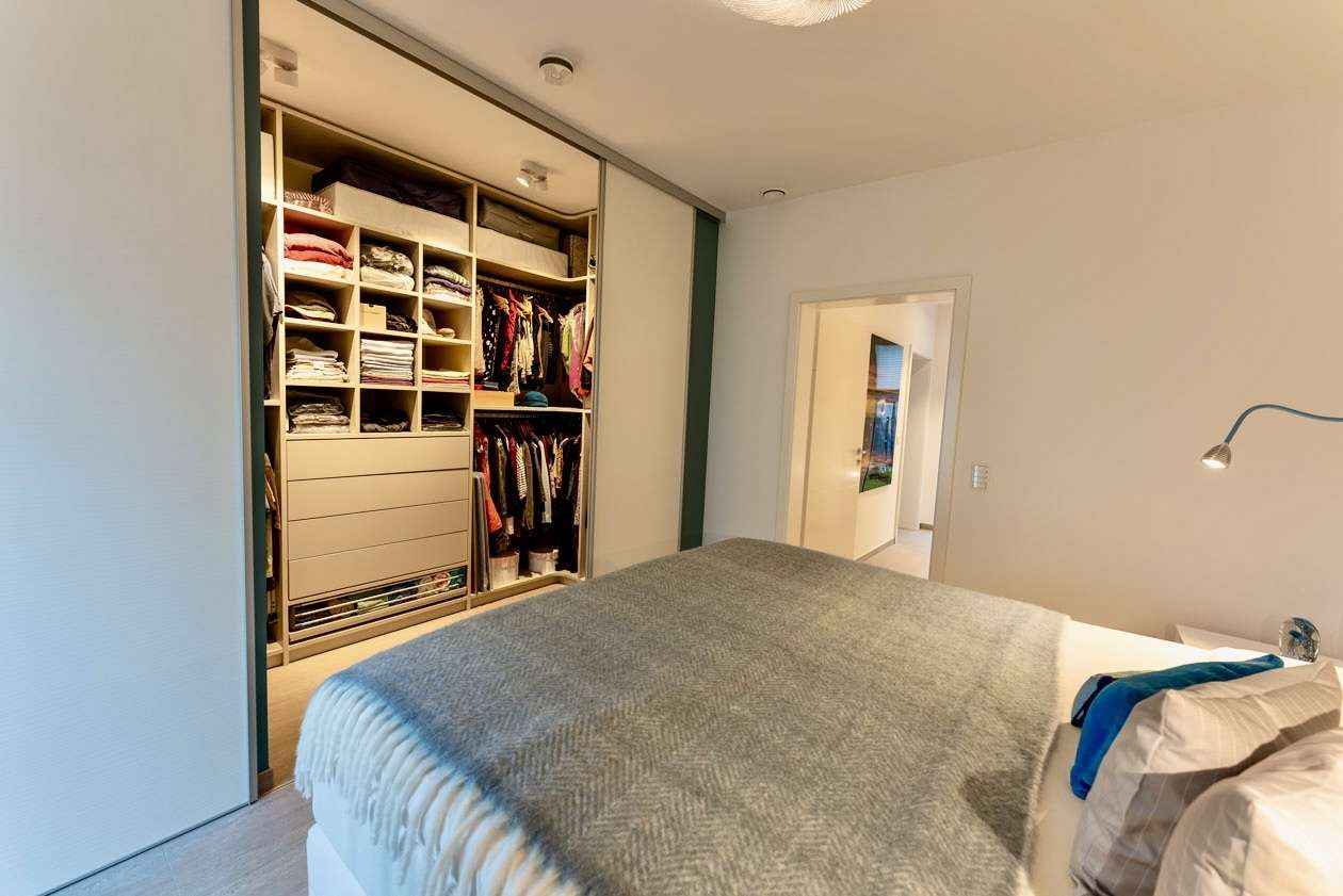 Ein separates Schlafzimmer mit begehbarem Ankleidebereich sowie das Masterbad mit freistehender Design-Badewanne, bodengleicher Dusche und Sauna sind ebenfalls im Gartengeschoss untergebracht.