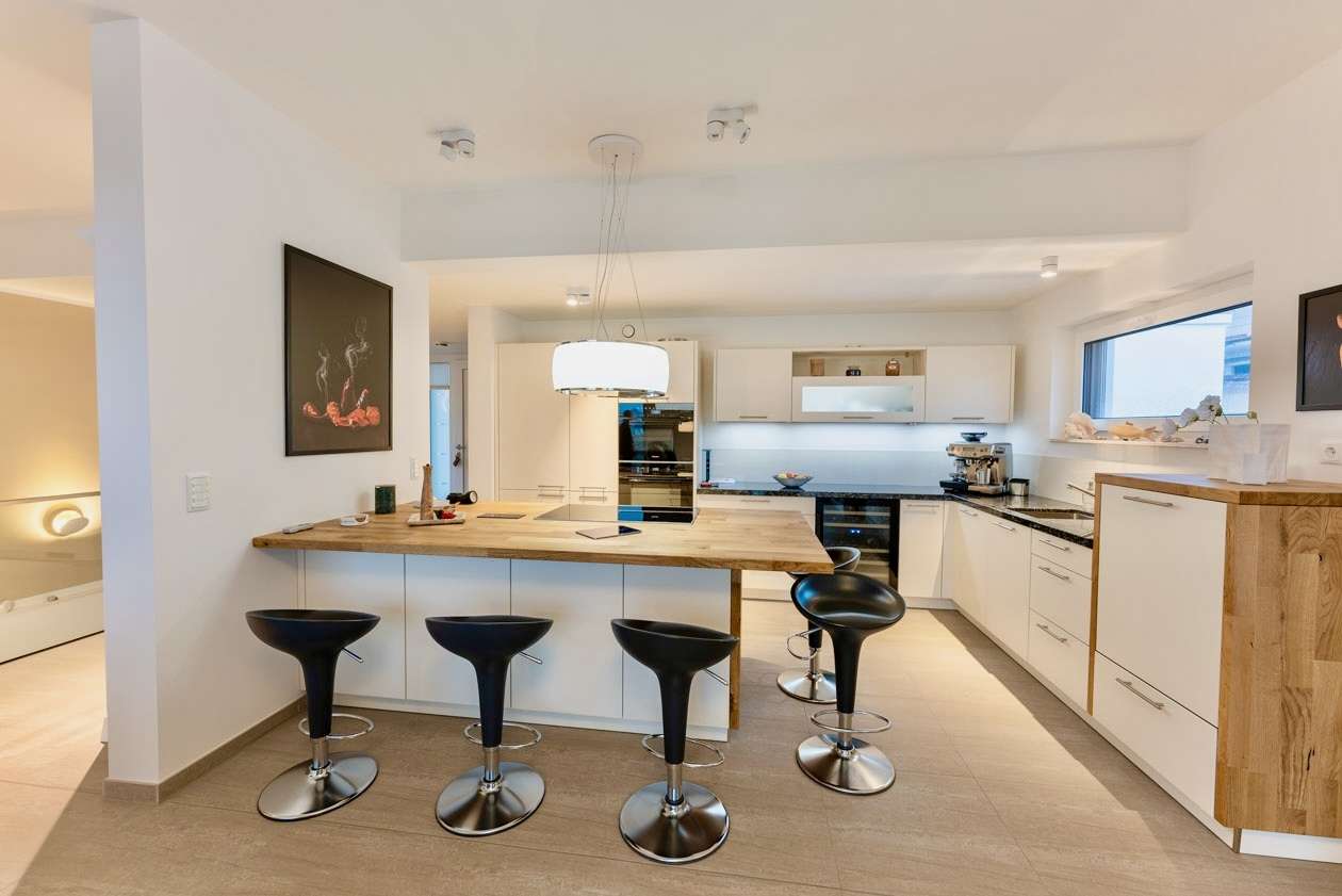 - Maßgeschneiderte Einbauküche mit breiter Kochinsel ausgestattet mit Backofen, Geschirrspüler, Weinkühlschrank
