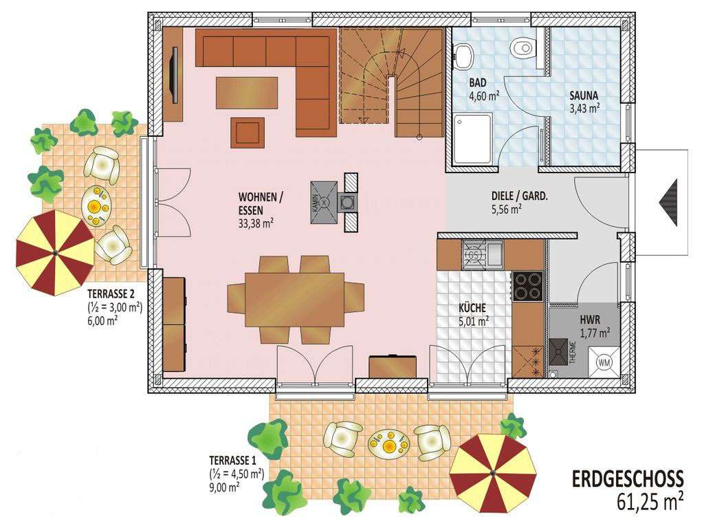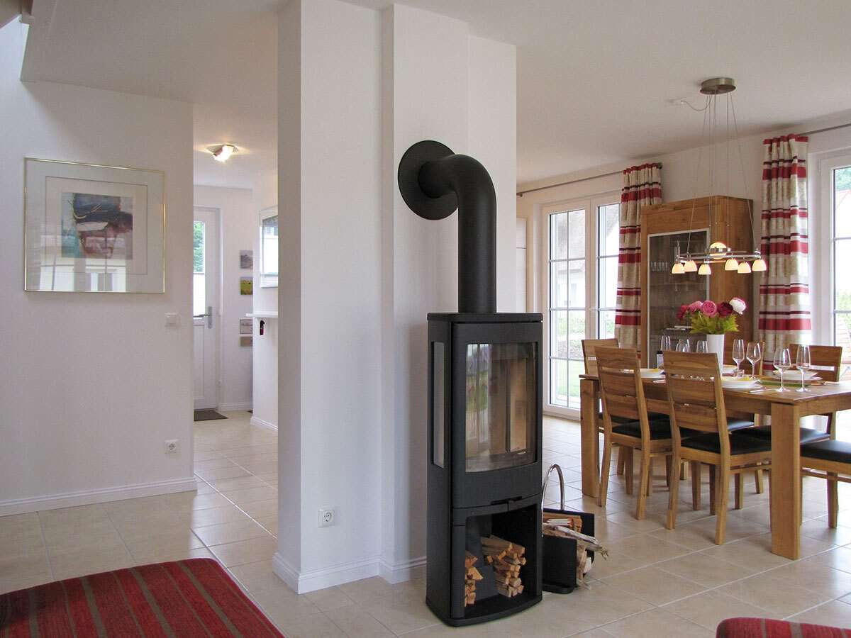 Beim Betreten des Erdgeschosses erwartet Sie ein großzügiger Wohn- Essbereich, der mit einem freistehenden Kamin zum Verweilen einlädt und nahtlos in die offene Küche übergeht. Die doppelflügeligen Fensterelemente öffnen den Wohnraum zur idyllischen Südterrasse, die zum Entspannen und Genießen bei sonnigen Stunden lockt. Eine Diele mit Garderobennische, ein Duschbad mit Sauna sowie ein praktischer Hauswirtschaftsraum komplettieren das Erdgeschoss.