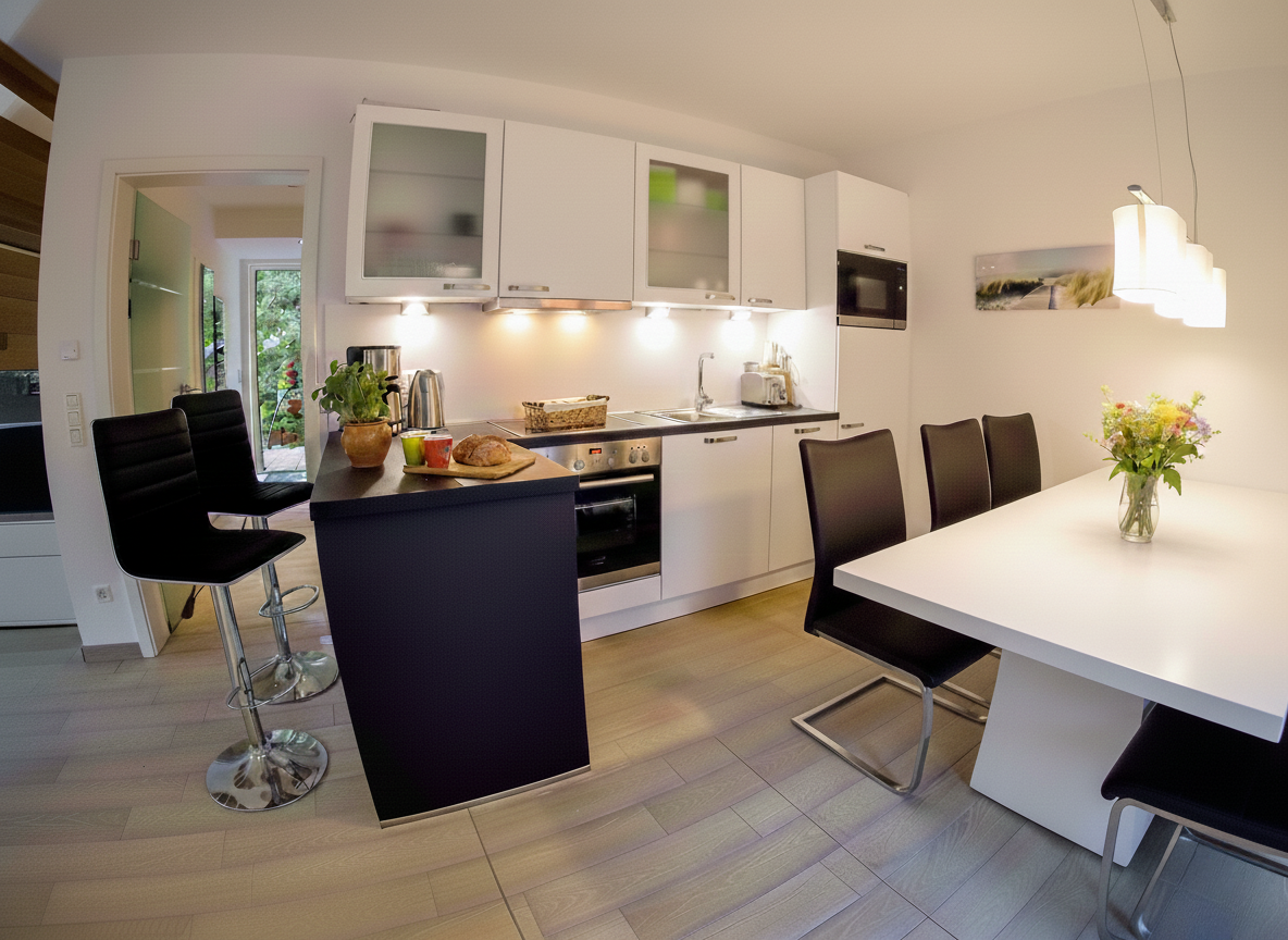 Die hochwertig ausgestattete Einbauküche ist offen in den Wohnbereich integriert und fügt sich harmonisch in das Gesamtkonzept ein. Sie unterstreicht die Großzügigkeit des Raumes und rundet das stimmige Wohnambiente perfekt ab. Ein Kamin schafft zusätzliche Gemütlichkeit und lädt zum Entspannen ein. Gemeinsam mit der im gesamten Haus installierten Fußbodenheizung (ausgenommen HWR) entsteht so ein rundum angenehmes und wohnliches Raumklima.