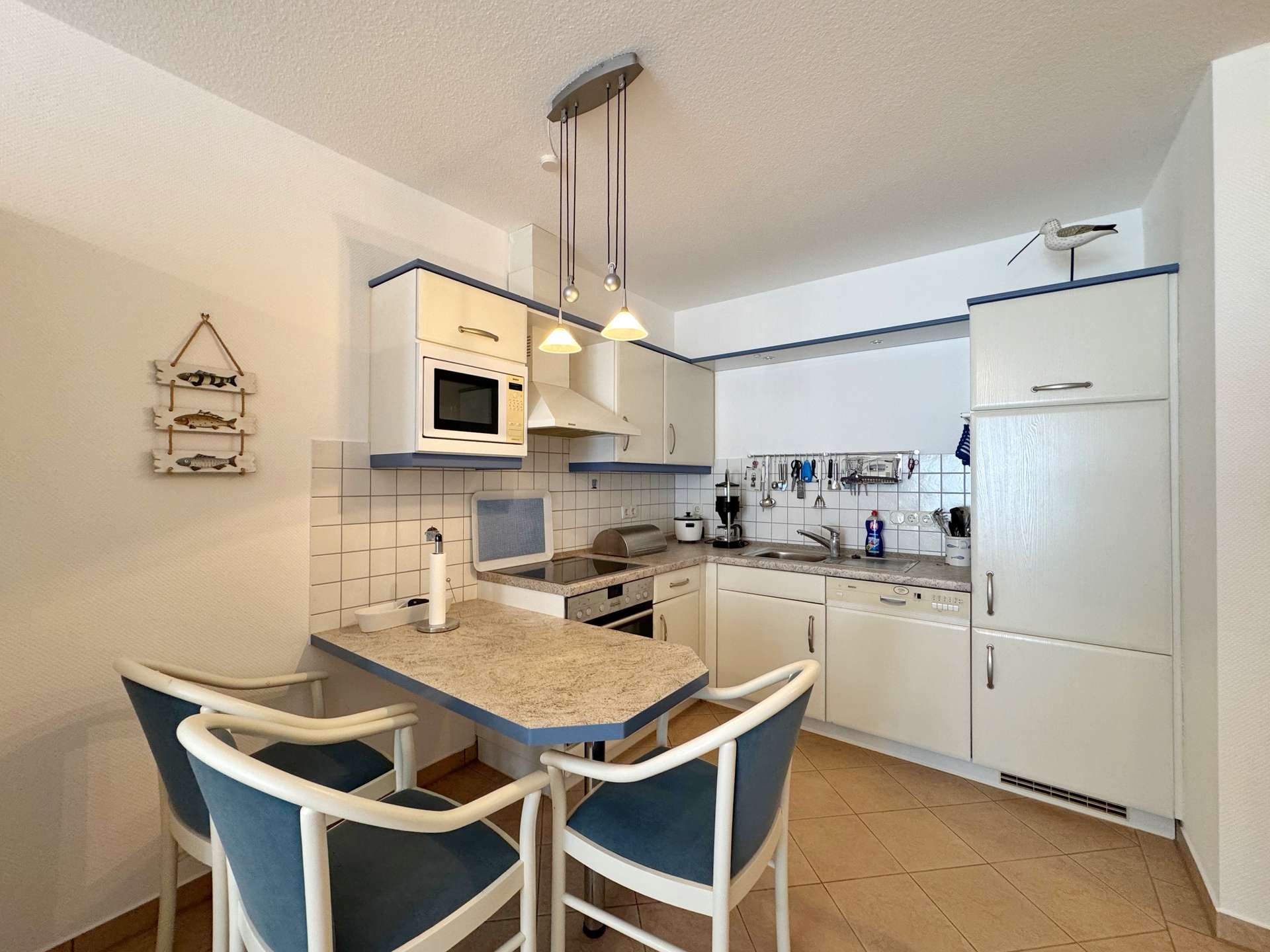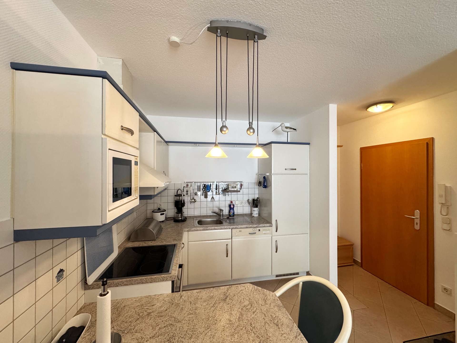 Nach dem Betreten der Wohnung öffnet sich der kompakte Eingangsbereich zu einem hellen, offen gestalteten Wohnraum mit integrierter Einbauküche – das zentrale Herzstück der Wohnung. Große Fenster lassen viel Licht herein und bieten Zugang zum großzügigen Balkon, der mit einem seitlichen Meerblick begeistert.