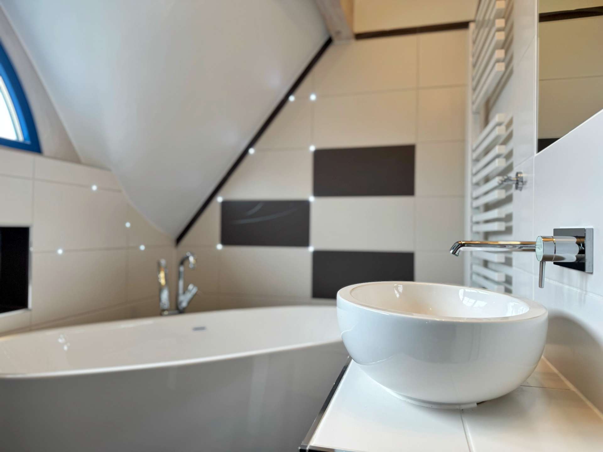 Zwei hochwertig ausgestattete Badezimmer bieten ein durchdachtes Wellnesskonzept: Im Erdgeschoss befindet sich ein Saunabereich mit Dusche, im Obergeschoss ein weiteres Bad mit freistehender Badewanne und zusätzlicher Dusche.