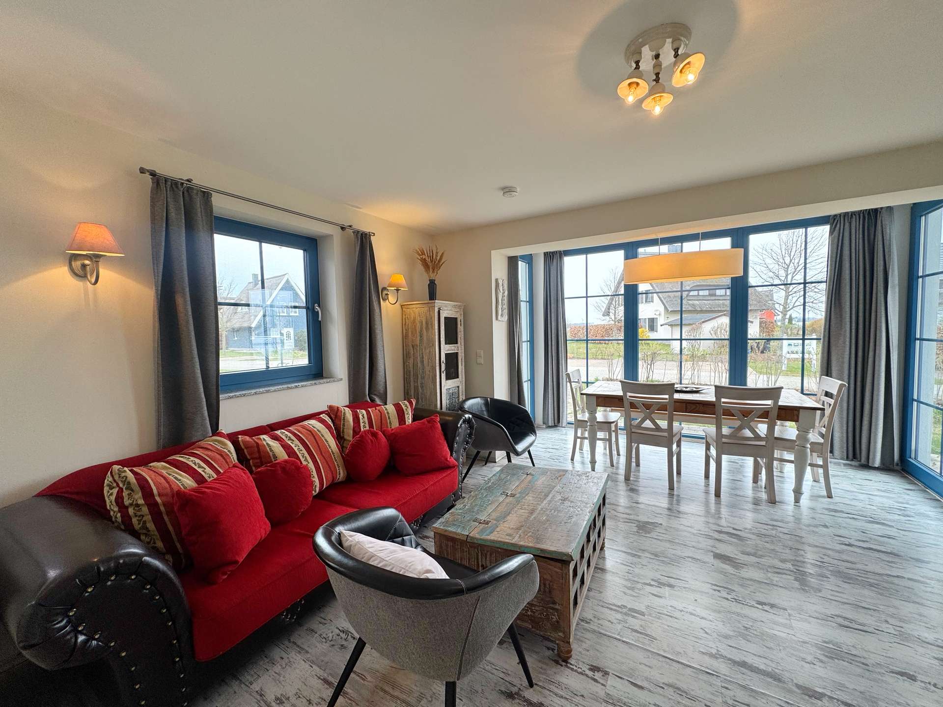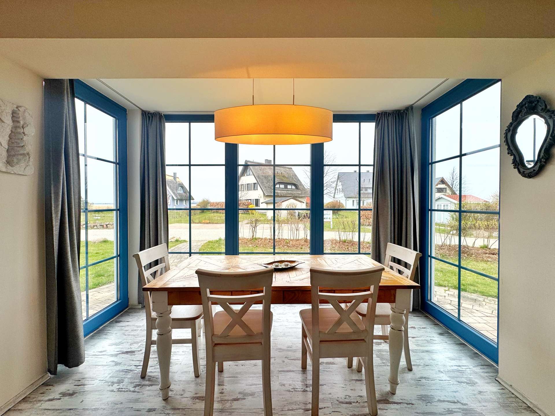 - Großzügiger Wohn-/Essbereich mit Kaminofen und Panoramablick auf den Breetzer Bodden