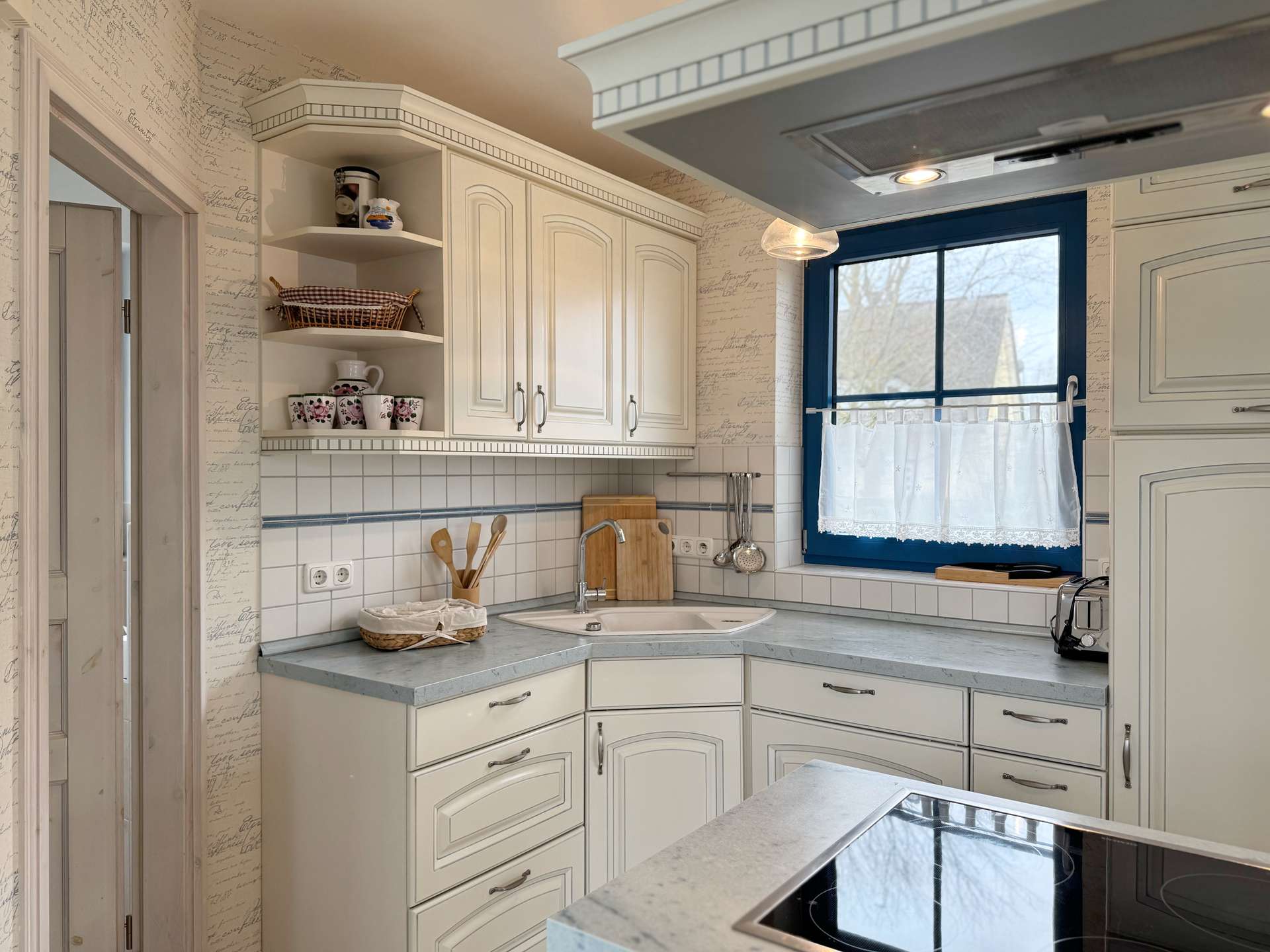 Das Herzstück des Hauses bildet der großzügige, offen gestaltete Wohn-, Ess- und Kochbereich. Ein Kaminofen im Wohnbereich sorgt für eine gemütliche Atmosphäre, während große Fensterflächen eindrucksvolle Ausblicke auf die Boddenlandschaft ermöglichen. Die Einbauküche mit Kochinsel im Landhausstil unterstreicht den Charakter dieser Immobilie und fügt sich harmonisch in das hochwertige, maritim geprägte Gesamtkonzept ein.