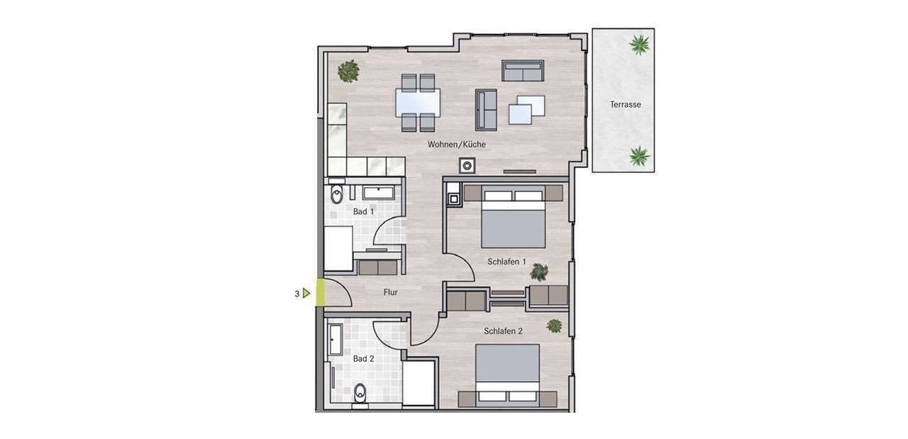 Die beiden 2 1 /2 geschossigen Apartmenthäuser sind im Erdgeschoss mit einem gemeinsamen Eingangsbereich und im Kellergeschoss mit der Tiefgarage verbunden.